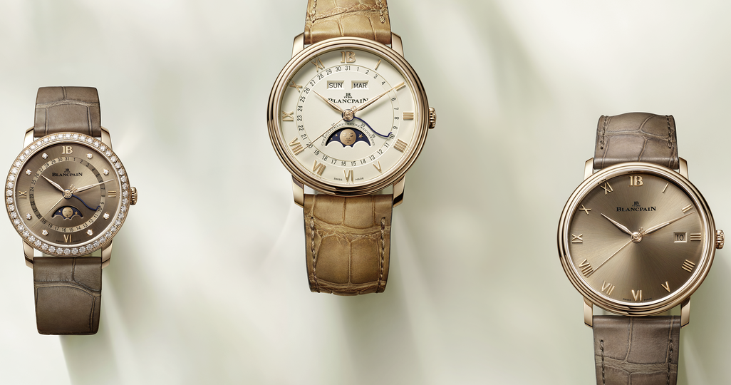 Infine il Villeret Ultra-plate, cassa in oro rosso ø 40 mm w.r. a m.30 spessore mm 8,70, con vetro e fondello in vetro zaffiro; A/h 21.600, Calibro automatico di Manifattura Blancpain 1151 la cui riserva di carica è di 100 ore, pari a circa 4 gg. Sul quadrante opaline o marrone dorato lavorato a soleil, lancette e indici trattati Super-LumiNova ® in oro bianco o rosso. La finestrella della data è stata ampliata. Infine il cinturino, a sgancio rapido e con fibbia déployante, è in cuoio grigio blu, miele o marrone.