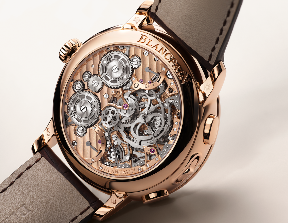 Nel mondo orologiero questa grande complicazione è stata affrontata in passato da pochissime Maison, ricordarne cinque forse è troppo; a noii è tornata subito in mente quella di Gerald Genta. Ricordi a parte ecco la Ref.15GSQ che, con questa grande complicazione, ha fatto iniziare una nuova era nella produzione Blancpain. Da rilevare che oltre alla classica melodia Westminster a quattro note (Mi Sol Fa Si) si può ascoltare una melodia originale intitolata “Blancpain” composta, sempre impiegando 4 note, dal musicista Eric Singer; un meccanismo con ruota a colonne consente di passare facilmente dall’una all’altra melodia. Ultra esclusivo tra gli orologi da polso con grande suoneria, i quattro quarti suonano ogni ora, offrendo una durata prolungata. La Grande Double Sonnerie di Blancpain è dotata di due bariletti separati: uno alimenta il movimento, l’altro la grande suoneria, la piccola suoneria e la ripetizione minuti offrendo un’autonomia di 12 ore quando la grande suoneria è attiva.