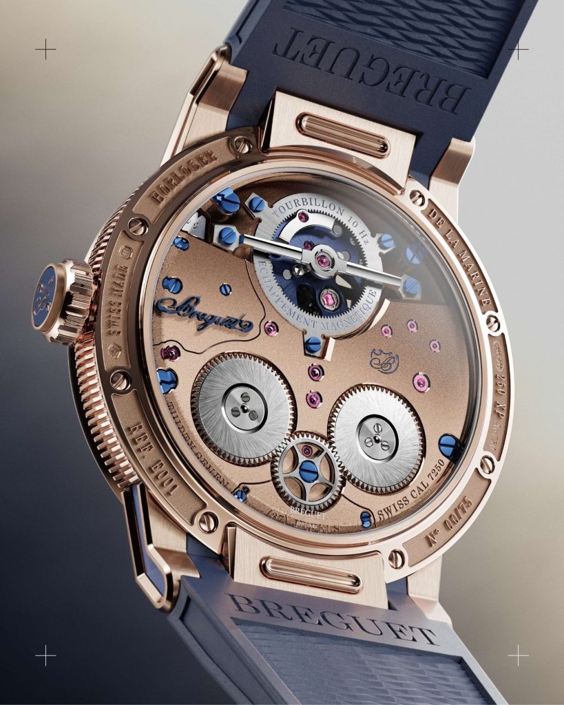 La cassa è quella della Collezione Marine con sei anse, realizzata in oro Breguet, ø mm 43,5; il movimento dell’orologio n°1 a carica manuale, Calibro 7250, non poteva che essere un Tourbillon modernamente interpretato, la spirale è in silicio, la ruota dei secondi fissa è in LIGA (NiP 12% amagnetico e gli altri componenti sono in titanio (grado 2, grado 5) o Nivagauss, i rubini sono 37, le A/h 36.000. Questo è il primo tourbillon 10 hz con scappamento magnetico a forza costante nella storia di Breguet; ha due ruote di scappamento (l’ispirazione viene dalla forza costante) ognuna dotata di una pista magnetica con al centro l’ancora con leve magnetiche, ma tra le due ruote c’è una ruota di arresto intermedia perché il dispositivo non subisca alcun salto indesiderato. Certificato dal punzone Breguet, categoria “Scientifico”, garantisce una precisione di marcia sulle 24 ore di +/- 1 secondo.