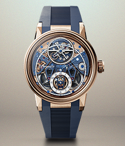 Esteticamente sul quadrante tre cerchi bianchi collegati e luminescenti attirano l’attenzione, su quello più largo l’indicazione delle ore, su quello centrale i minuti e, a ore 12 intorno alla gabbia del Tourbillon si vedono i secondi; la scritta Experimental 1 in blu sulla platina in oro completa l’intero disegno.