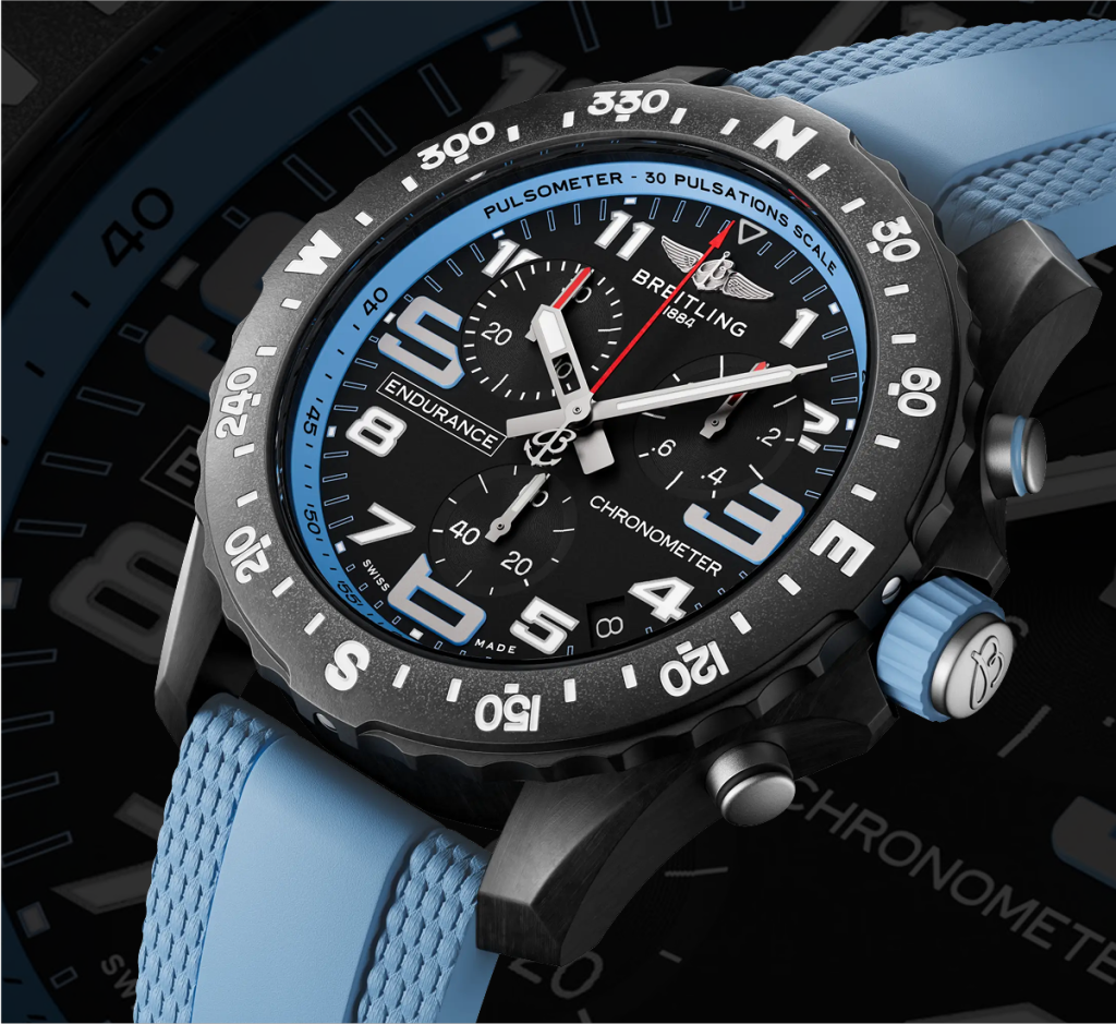 Il 1° Agosto abbiamo pubblicato i Breitling per la Festa Nazionale Svizzera e la Fondazione che aiuta i giovani atleti elvetici, oggi ci occupiamo di un orologio che per le sue dimensioni, ø 38 mm è adatto ai polsi femminili; l’Endurance Chronogaph Chronometer in acciaio che indica sul rèhaut azzurro la scala delle pulsazioni, sulla lunetta nera indicazioni in bianco.