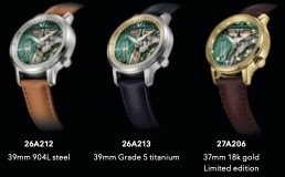 Da notare infine che per il nostro mercato sono state previste due referenze. La Ref-26A211, cassa da 39 mm in acciaio inossidabile 904L lucido con anse dritte e corona a ore 4, cinturino in vitello di colore nero con chiusura déployante. Il vetro zaffiro a doppia cupola offre una vista completa del movimento attraverso il quadrante aperto decorato da un anello esterno argentato su cui sono stampati gli indici delle ore con LumiNova, come le lancette. La Ref.26A213 ha la cassa da 39 mm in titanio grado 5 con anse dritte e corona a ore 4, abbinata a un cinturino in vitello di colore blu con chiusura déployante. Il movimento caratterizzato dallo scorrimento continuo della lancetta dei secondi appare con tutte le sue decorazioni attraverso il quadrante aperto sovrastato dal vetro zaffiro a doppia curvatura. Il quadrante aperto è limitato all’esterno da un anello delle ore color champagne sul quale sono stampati gli indici delle ore con trattamento LumiNova, come le lancette.