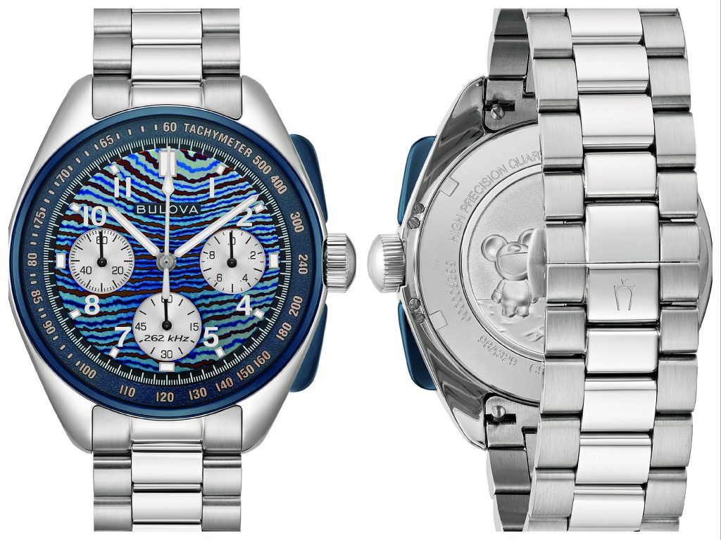 Queste le principali caratteristiche del nuovo cronografo Bvlova. La cassa in acciaio inossidabile misura mm 43, ha uno spessore di mm 14,3 ed è w.r a m.50. Sul quadrante in Timascus disegnato dall’artista e protetto da vetro zaffiro la scala tachimetrica è stampata in blu, i contatori sono in color argento, lancette e indici sono trattati Super-luminova. Il movimento HPQ (High Precisionist Quartz) ha un brevetto Bulova e garantisce la precisione fino a 1/20 di secondo. Il bracciale in acciaio a tre maglie ha la finitura lucida e satinata. Nella confezione speciale oltre all’orologio è inserito un esemplare di Budij alto 15 cm firmato sul retro dall’artista, ed è incluso anche uno fascicolo che racconta la storia del Lunar Pilot.