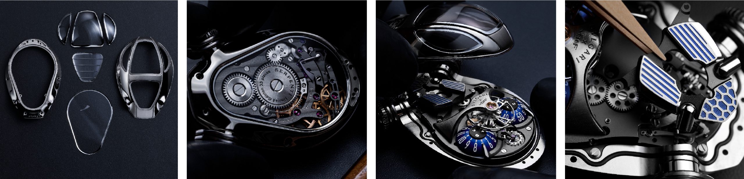A monte, queste mutevoli realtà dipendono da un tratto di matita che deve integrarsi in un concetto di completa armonia estetica e numerose sono state le difficoltà da superare per unire i materiali necessari al risultato finale: vetro zaffiro (per gli occhi del serpente e per la sezione posteriore sfaccettata che ricorda le squame dei rettili) e gli elementi metallici della cassa corredata da un rivestimento antiriflesso sui lati e ampie aperture sul movimento. Nell’intenso lavoro di progettazione si è inserita anche la passione per le automobili che unisce i due direttori creativi e si può quindi immaginare che la cassa sia una carrozzeria completa di vari elementi, dal lunotto posteriore alla griglia del radiatore, alle ruote che hanno coinvolto anche parti del movimento.