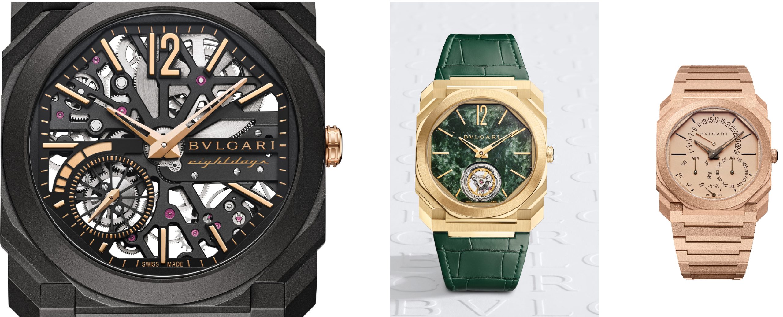 Da dx verso sx (quasi fossimo in Arabia) l’Octo Finissimo Q.P. presenta una sofisticata finitura ‘frosted’ dell’oro, introdotta per la la prima volta nel 2022 nel Finissimo oro rosa e poi nel Ripetizione Minuti. L’Octo Finissimo Tourbillon Marmo rinnova l’impegno tecnico ed estetico della Maison con la cassa in oro giallo, ø40 mm, spessore 4.85 mm, sottilissimo il rivestimento in marmo verde del quadrante. Infine l’Octo Finissimo Skeleton 8 Days che arriva dopo le precedenti versioni in oro rosa e titanio; questo affascina per i dettagli. Indici e lancette in oro rosa spiccano all’interno della cassa in titanio trattata DLC nero. Il Calibro di Manifattura BVL 199SK a carica manuale ha uno spessore di mm 2,50, presentato nel 2022, garantisce una carica di 192 ore, cioè 8 giorni; qui ha diverse gradazioni di oro rosa e a ore 3 sotto il logo Bvlgari si legge “Eight Days”.