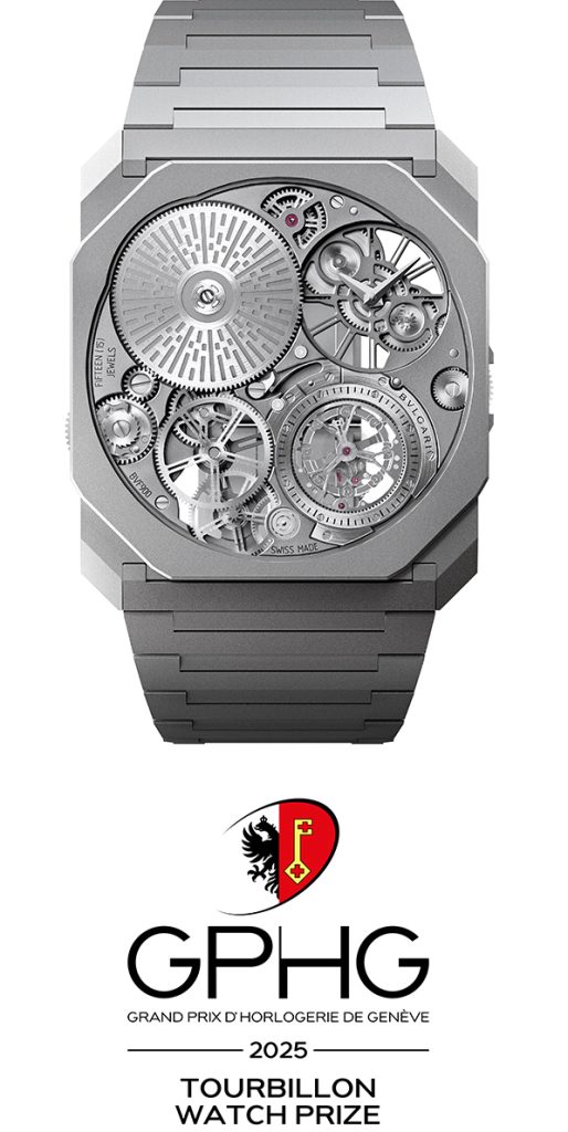 Queste le caratteristiche del Bvlgari Octo Finissimo premiato nella categoria Tourbillon del 25°GPHG, Movimento meccanico ultrasottile a carica manuale con tourbillon BVF 900. Platina in carburo di tungsteno. Ruote di carica e regolazione dell’ora in acciaio inossidabile con finitura spazzolata circolare. Cricchetto in acciaio con finitura spazzolata circolare, inciso con una decorazione geometrica.