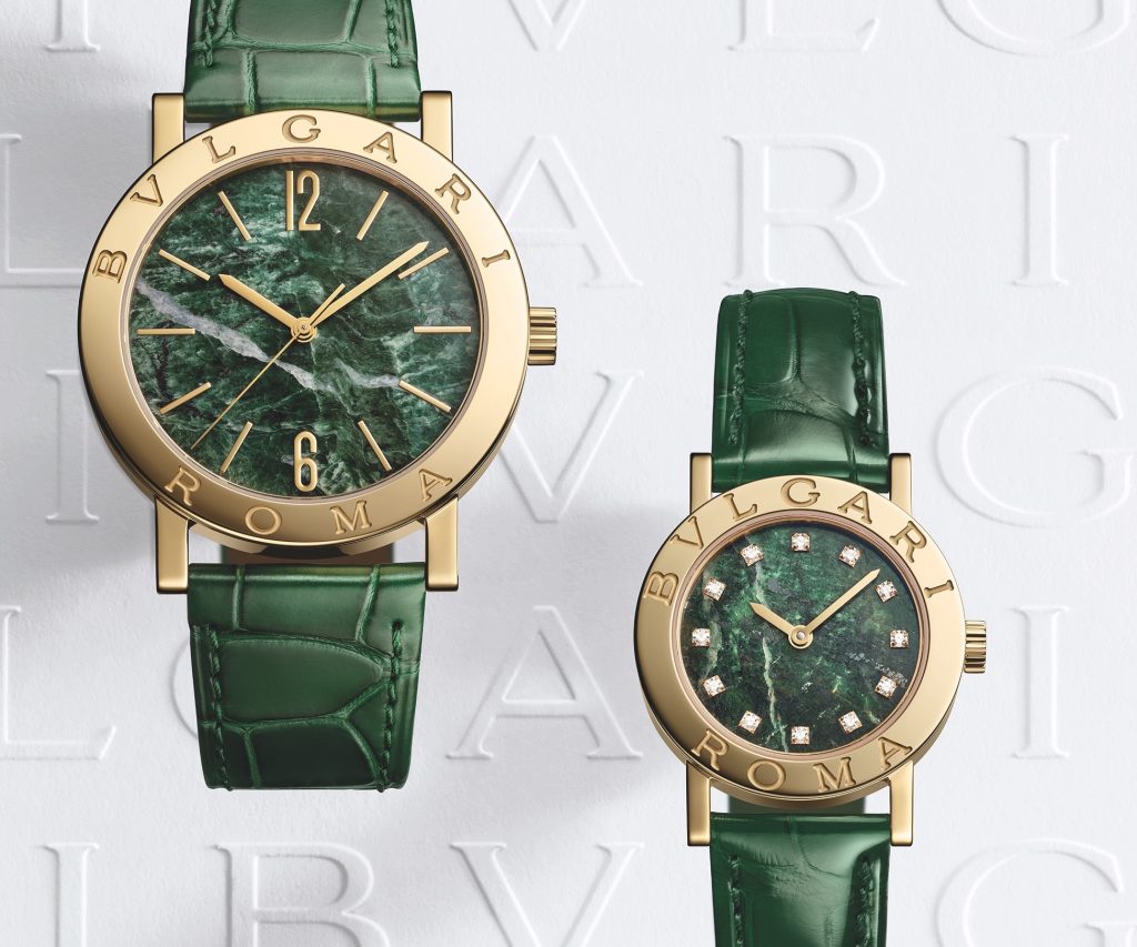 Per l’anniversario del 50° quattro Bvlgari Roma in due misure di cassa (26 e 38 mm) hanno i quadranti in marmo, un materiale che nella Città eterna è “di casa”, Bvlgari ha spesso incorporato il marmo nelle sue creazioni, in particolare nella gioielleria, ma lavorarlo per un quadrante ha rappresentato una vera sfida dato il sottile spessore richiesto. I Bvlgari Roma con cassa in oro rosa ø 26 mm, quadrante in marmo Blu sfumato con indici in diamanti e cinturino celeste, sono in tiratura illimitata, quelli mm in oro giallo (Ref.104112 e Ref.104111) cassa ø 38 e 26 mm hanno il quadrante in marmo Verde Alpi, cinturino in alligatore a squama larga e sono realizzati in 150 esemplari per l’Anniversario. A questi si aggiungono altre novità BB con quadranti in marmo di altri colori ma anche in onice nero. Sui Bvlgari-Bvlgari del secolo passato circolavano molti “rumors”: sembra infatti che Nicola Bvlgari, avesse chiesto al Gerald Genta di far combaciare gli indici con le lettere del Marchio, cosa impossibile visto il numero delle lettere a disposizione e che avesse accettato a malincuore i BB. Un’altra curiosità. è rappresentata dagli orologi Bvlgari-Bvlgari con il movimento automatico ETA che Bvlgari nel secolo scorso realizzò con cassa e lunetta in plastica (tipo gli Swatch) da regalare a VIP e Media di varie città; sul quadrante cifre arabe al 12 e al 6; alle 3 la finestrella della data e indici in oro; su quello che ancora oggi indosso, c’è scritto: Milano/0013.