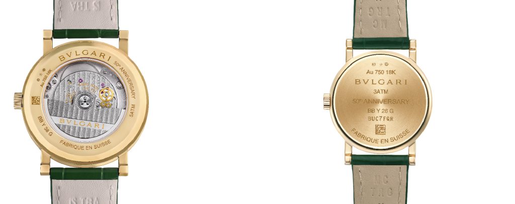Bvlgari Roma ø 38 e 26 mm con quadranti in marmo Verde Alpi (foto da Orologi e Passioni) e sotto i due fondelli dei Bvlgari Roma con incisioni dell’Anniversario, a sx quello 38 mm con il movimento automatico di Manifattura, a dx quello di 26 mm al quarzo; entrambi Swiss Made