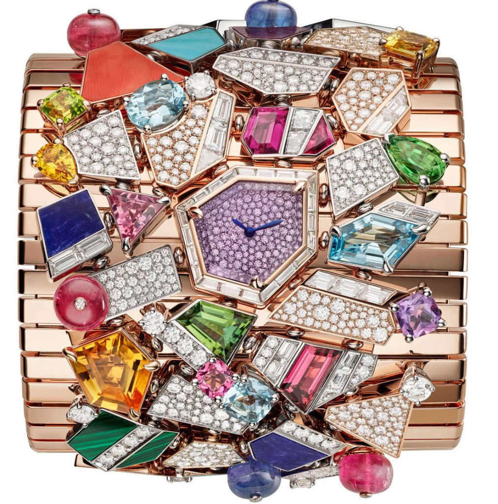 Nella foto sotto l’orologio manchette di Alta Gioielleria Tubogas e Colori in oro rosa, bianco e giallo, incastonato con un’ametista taglio fancy da 6,65 ct, citrino (4,40 ct), topazio (2,77 ct), tormaline rosa (2,86 ct), tormalina verde (1,99 ct), rubelliti (1,72 ct) e berillo giallo (0,70 ct) tutte taglio fancy; zaffiro (2,24 ct), acquamarina (1,36 ct), ametista (0,93 ct), peridoto (0,81 ct) e tormalina (0,55 ct) taglio cuscino; acquamarina taglio ovale (1,64 ct), tsavorite taglio a goccia (2,10 ct), diamanti taglio baguette (3,73 ct), diamanti rotondi taglio brillante (10,58 ct), bead di rubelliti (10,20 ct), tanzaniti (7,43 ct) e tormalina verde (3,47 ct), oltre a sodaliti, turchesi, malachiti, radici di rubino e corallo taglio fancy. Quadrante impreziosito da pavé di diamanti (0,55 ct) e lancette blu. Movimento micro-meccanico di manifattura a carica manuale Piccolissimo dello spessore di 2,5 mm, con riserva di carica di 30 ore e frequenza di 21.600 alternanze/ora (3 Hz).