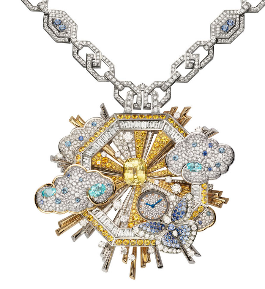 Nuvole Preziose, in oro bianco e oro giallo ha una cassa ø 58 mm (spessore 8,45 mm) e una catena di 76 cm (riducibile a 48), incastona 1 zaffiro giallo taglio cuscino certificato da 6,88 ct, diamanti rotondi taglio brillante (18,20 ct), zaffiri gialli (10,63 ct), zaffiri blu (3,00 ct), acquemarine (0,47 ct), diamanti taglio baguette (5,90 ct), tormaline Paraiba taglio ovale (1,81 ct) e diamanti taglio a goccia (0,61 ct). Il quadrante impreziosito da pavé di diamanti (0,23 ct) e 12 zaffiri arancioni taglio brillante (0,05 ct) ha indici e lancette blu. Sipuò completarlo con due orecchini amovibili. Il movimento micro-meccanico di manifattura a carica manuale Piccolissimo dello spessore di 2,5 mm, con riserva di carica di 30 ore e frequenza di 21.600 alternanze/ora (3 Hz).
