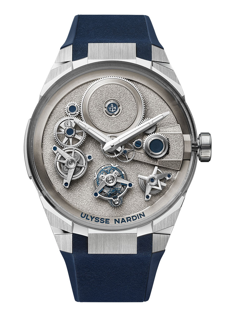 Only 50 Blast Free Wheel Maillechort have ben done by Ulysse Nardin with white gold case and manufactured movement with complications.