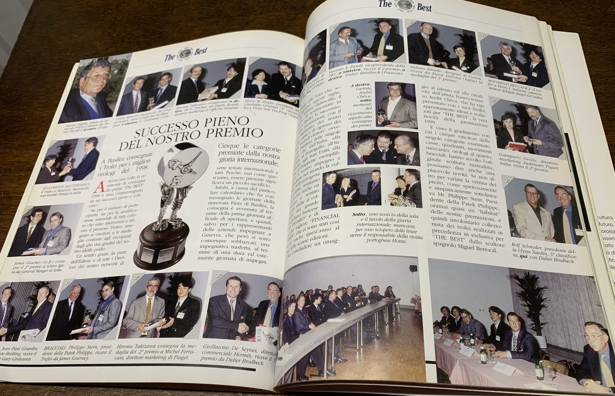 Il Premio The Best, ideato dall’editore di Orologi da POLSO proseguì, dopo il 1996 per alcuni anni; veniva assegnato dalla giuria composta dalle riviste del network pubblicate in Italia, Francia, Inghilterra, Portogallo, Stati Uniti, Giappone e premiava le Case per le categorie: casse, quadranti, bracciali e movimenti anche sotto il profilo del design. Nel 1996 ho consegnato il premio per i quadranti al designer Stefano Milello intervenuto in rappresentanza di Corum (da dx in alto seconda foto). Questi i premiati, da sx a destra foto in alto: Maurizio Mazzocchi di Swatch Group in rappresentanza di Blancpain premiato da G.Girdvainis (U.S.); Angelo Bonati riceve il premio dal direttore della rivista giapponese; Karl.H.Pfeifer e il direttore giapponese che nella foto a destra premia Girard-Perregax rappresentato dal direttore Marketing; Didier Brodbeck (Francia) premia Hannes A.Pantli di IWC; Stefano Milello e Elena Introna; il trofeo consegnato dal direttore giapponese a Henry J.Belmont di JLC per il movimento. Sotto G.Grollo direttore Marketing Audemars Piguet Italia e E.Introna; Rolf Schnyder presidente Ulysse Nardin e Didier Brodbeck. Nella colonna a sinistra, sotto la foto dell’editore Eugenio Zigliotto ideatore del Premio, Elena Introna consegna il trofeo a M.Mazzocchi Omega per i movimenti elettronici; J.Gourney (Inghilterra) premia il General Manager di Seiko; il vice Presidente di Breitling premiato da G.Girdvainis; J.Gourney premia per i bracciali Philippe Stern proprietario di Patek Philippe; Michel Ferracani, direttore Marketing Piaget premiato dal responsabile del Giappone e nell’ultima foto Guillaume Seynes direttore Commerciale Hermès e Didier Brodbeck (Francia).