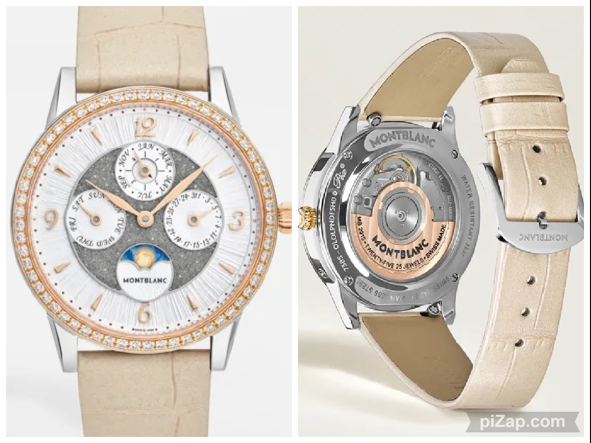 Del tutto inedito lo sfondo dei sub quadranti su una scintillante tonalità di grigio scuro che si sovrappone alla fascia delle ore; questo sfondo non è composto da polvere di diamanti, ma incastona minuscole pietre preziose l’una accanto all’altra per creare una superficie uniforme poi rivestita con una brillante finitura PVD metallizzata. Altrettanto interessante sotto il profilo estetico, l’anello delle ore realizzato con una tecnica di stampaggio chiamata filé d’étoiles (star trail o scia di stelle). Le indicazioni nei tre sub quadranti superiori sono in un font che ricorda la scrittura a mano, gli orologi sono arrivati da Montblanc dopo il successo dei suoi strumenti da scrittura.