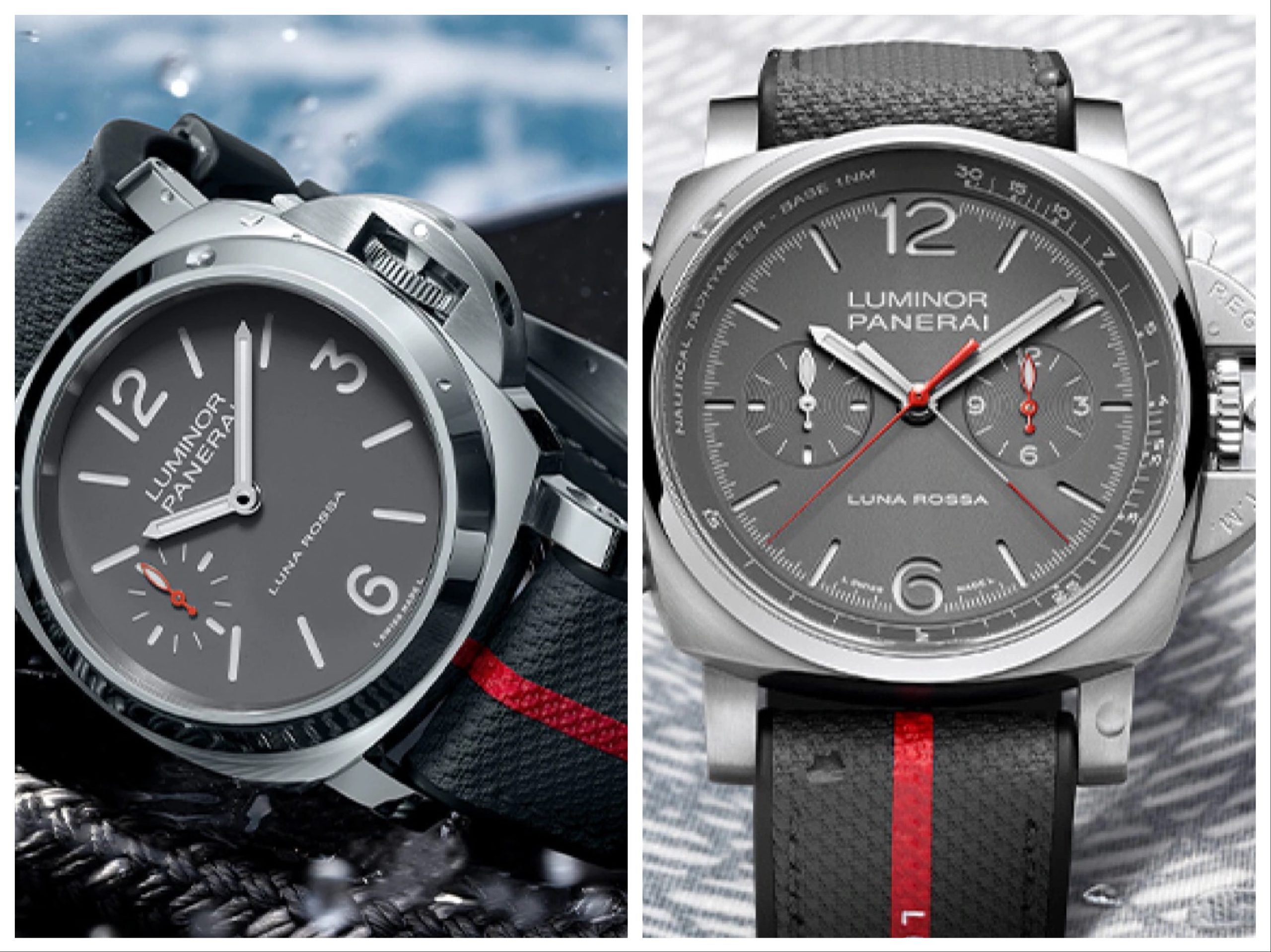 Sul mercato sono già disponibili i due Luminor della collezione Luna Rossa (entrambi con cassa w.r. a 10 Bar) che pubblichiamo nella foto sotto, a sinistra il solo tempo carica 3 gg e a destra il cronografo. Il Luminor Luna Rossa PAM01653, è in acciaio inossidabile AISI 316LVM – 1.4441, lega durissima che resiste alla corrosione, composta da ferro con un contenuto di cromo (17-19%), nickel (13-15%) e molibdeno (2,5-3,2%); per accentuarne le proprietà, l’acciaio viene sottoposto ad un processo di rifusione sotto vuoto mediante arco elettrico (VAR). Il Luminor Cronografo Flyback Luna Rossa PAM1654, prodotto in soli 150 esemplari, ha la cassa in titanio ø44mm, il suo movimento è il calibro P.9100, il primo movimento automatico di Panerai con funzione cronografica flyback e scala tachimetrica ad uso nautico.