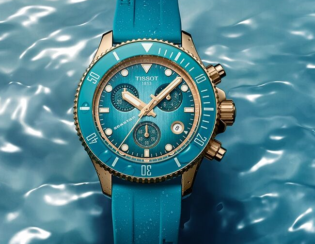 Continuiamo con i nuovi Tissot che questa volta non si dedicano agli appuntamenti internazionali in bicicletta, ma sono perfetti per le vacanze al mare come il cronografo Seastar ø 38 mm, proposto in sei diverse interpretazioni tra le quali scegliere quella che esteticamente è la più adatta al proprio gusto. I movimenti sono al quarzo svizzero, le casse sono tutte w.r. a m.300 con lunetta girevole unidirezionale in vetro minerale colorato; i quadranti spazzolati verticalmente sono sfumati, lancette e indici sono trattati Super-LumiNova®; bracciali facilmente intercambiabili a 5 file di maglie o cinturini al silicone.