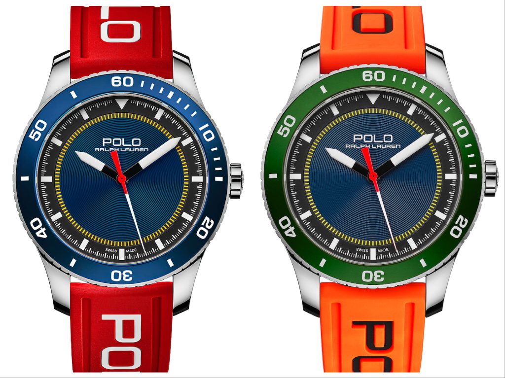 Concludiamo questa veloce carrellata con due Ralph Laurent Polo Sport, molto colorati, con cassa in acciaio ø 42 mm, w.r. a 10 Bar, spessore mm 12,35; fondello chiuso, corona in acciaio inossidabile con logo Pony, lunetta girevole colorata, vetro zaffiro bombato, cinturino in caucciù intercambiabile con fibbia in acciaio lucido con incisione Polo, quadrante sfumato laccato blu o nero opaco azzurrato, lancette a gladio nere trattate Super-LumiNova® a luce bianca; la scritta Polo Ralph Lauren è stampata. Il movimento automatico è il Calibro RL200 Swiss Made lavorato a Côtes de Genève verticali e perlage. Le A/h sono 28.800, i rubini 26 e l’autonomia è di 38 ore. Il Polo Sport Ref.100030788, è presentato in una elegante custodia nella quale sono inseriti il manuale di istruzioni e il certificato di garanzia.