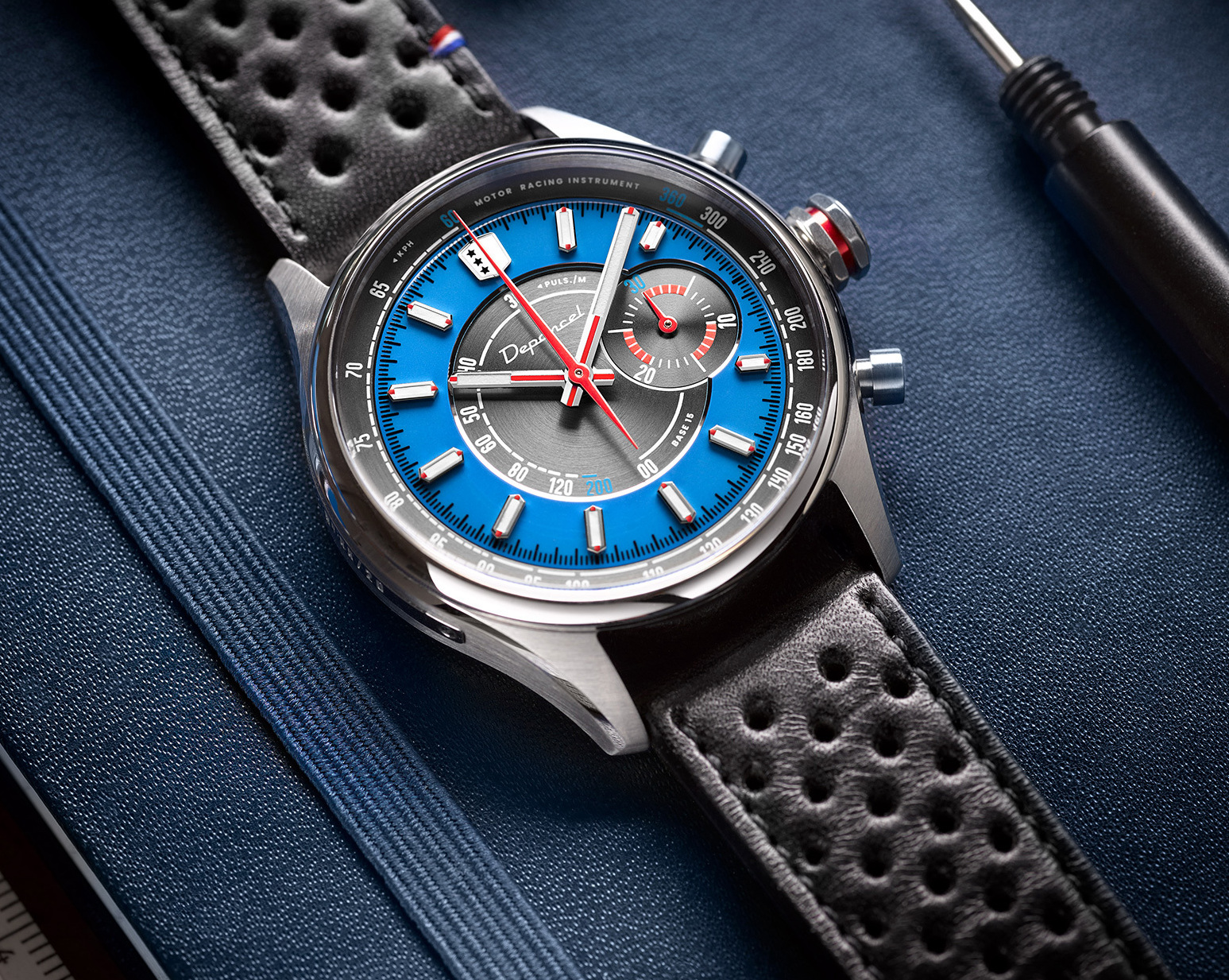 “Allure Valjoux 92 Bleu de France” il movimento Valjoux 92, famoso in passato per il pignone oscillante, rivive nel nuovo orologio di Depancel (17 rubini e ruota a colonne); sul quadrante oltre ai colori “France Racing Blue” che distinguevano le automobili da corsa, a partire dalle famose Bugatti, un’accurata finitura a testimonianza di un attaccamento alle tradizioni artigianali dell’orologeria. La cassa ø 36 mm, in acciaio 316L accoglie un movimento manuale A/h 18.000 con una riserva di carica di circa 30 ore, restaurato e ottimizzato con la ruota a colonne, dai Maestri orologiai di Depancel. Questo orologio “seconda mano”, garantendo fluidità e precisione del movimento cronografico, sarà senz’altro apprezzato da chi ama gli orologi Vintage.