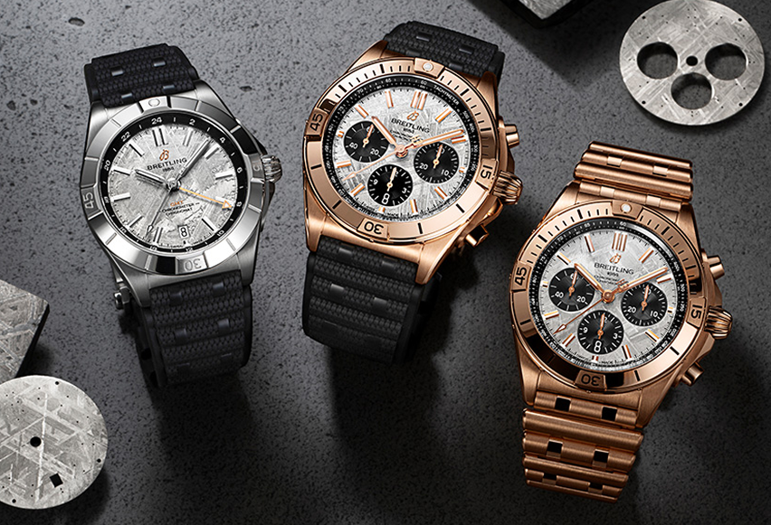 Il Chronomat Automatic GMT, dedicato alla superstar del calcio mondiale il norvegese Erling Haaland brand ambassador di Breitling (che ha collaborato attivamente con gli stilisti e i tecnici) presenta una cassa in acciaio con lunetta in platino. È arricchito da una lancetta GMT in oro rosso e dalle iniziali di Erling sulla lancetta centrale dei secondi. Il fondello reca le incisioni «ONE OF 500» e «Erling Haaland 9» intorno al ritratto dello stesso Haaland nel suo caratteristico gesto di esultanza dopo un gol. ll quadrante è in un meteorite caduto in Svezia un milione di anni fa. L’orologio è completato dal classico bracciale rouleaux in acciaio o da un cinturino in caucciù nero che ne riprende lo stile. Le due versioni realizzate sono in edizione limitata: 500 automatici sono in acciaio con lunetta in platino e le iniziali EH sulla lancetta dei secondi; sul fondo l’incisione “One of 500” e “Erling Haaland 9” I 250 cronografi con cinturino o bracciale sono in oro rosso e sul fondo a vista hanno inciso “One of 250” e il ritratto del calciatore.