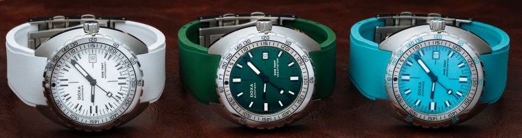 Con una robusta cassa a cuscino riprogettata (lo spessore è di mm 12) in acciaio inossidabile, ø 45×47 mm, w.r. a m.750, la novità è disponibile con una vasta scelta cromatica per i quadranti, proposti negli otto colori DOXA: arancione Professional, nero Sharkhunter, bianco Whitepearl, grigio argento Searambler, blu scuro Caribbean, giallo Divingstar, turchese Aquamarine e verde scuro Sea Emerald, da abbinare al bracciale integrato in acciaio inossidabile “grani di riso” o al bracciale in caucciù FKM più leggero, morbido e flessibile.