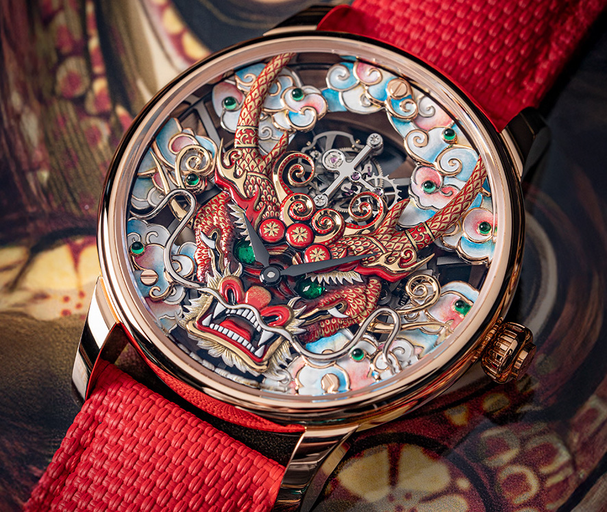 La maschera del drago intagliata in un blocco di oro e poi applicata su un fondello decorato, è stata incisa, scolpita e dipinta su una lega in oro bianco giallo e rosso; il drago ha curve cesellate e spicca sul quadrante con le corna tese, i baffi a volute, le zanne acuminate; l’opera ha comportato quasi un anno di progettazione e oltre 200 ore di lavoro nel comparto Métiers d’Art. Molte anche le pietre preziose, che le aggiungono fascino, inclusi smeraldi taglio cabochon (con incastonatura a castone ribattuto) che sono infusi nella materia lavorata. A un simile lavoro, che probabilmente resterà un pezzo unico, corrisponde un prezzo adeguato ma imponente con Iva inclusa (CHF 450.000,00).
