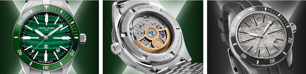 Per la prima volta nella sua lunga storia, iniziata nel 1737, Favre Leuba ha realizzato due interpretazioni della serie Deep Raider Renaissance impiegando quadranti in meteorite e malachite; l’ispirazione cromatica trae origini dal Deep Blue del 1964 mentre le linee della collezione Renaissance sono quelle ideate nel 2024. La cassa in acciaio inossidabile, ø 40 mm, w.r. a m. 300, ha la lunetta girevole unidirezionale in ceramica con inserto trasparente; il movimento automatico di produzione svizzera e finemente decorato secondo la migliore tradizione, è il Calibro FLD02, visibile dal fondo in cristallo di zaffiro; la riserva di carica è di 68 ore, la massa oscillante dorata 4N è scheletrata.