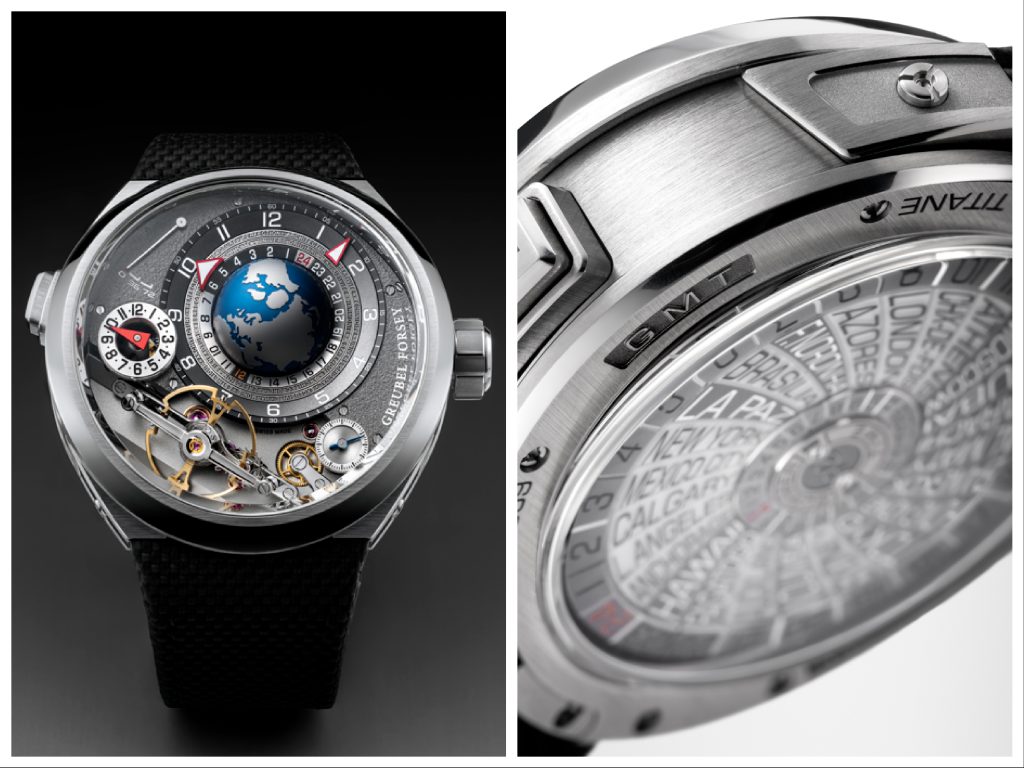 Sul quadrante à stato inserito un indicatore della riserva di carica che è di 72 ore; i bariletti sono due a rotazione rapida. Nella cassa con vetro zaffiro galbé è stato inserito un movimento ridisegnato che riunisce 496 componenti (73 in più di quelli del precedente) per garantire la precisione cronometrica, lo scappamento sospeso è rimasto inalterato. Il globo terrestre in titanio con l’Oceano blu, mostra in rilievo i continenti, in due colori l’anello del giorno e della notte, l’indicatore GMT è in oro come l’indicatore dei piccoli secondi, l’anello delle ore e dei minuti, rodiati manualmente, è laccato. Le lancette di ore e minuti sono a triangolo trattato SuperLuminova e anche l’indicatore del secondo fuso e a triangolo rosso, mentre sulla destra in basso, in acciaio azzurrato si vede la lancetta dei piccoli secondi. Infine il cinturino è in caucciù con fibbia in titanio con il logo GF; a richiesta si può ordinare il bracciale in titanio a tre maglie e fibbia déployante con logo GF.