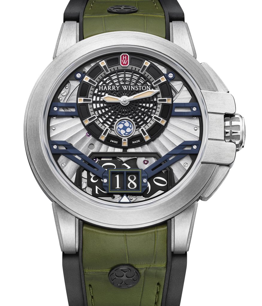 Il ponte di Manhattan con le torri e le capriate, che ha ispirato l’orologio, vede in nero i ponti che attraversano il quadrante (sostenendo il disco decentrato di ore e minuti a mezzogiorno e il grande datario alle 6)e a questa versione si aggiungeranno presto anche quelle con i ponti in rosso e in giallo. I componenti del movimento sono accuratamente rifiniti. Gli indici sono trattati con un rivestimento luminescente nero, con punte azzurre, beige o turchesi che si abbinano alle lancette. Alle 12 il caratteristico smeraldo Harry Winston in oro 18 carati, che al buio diventa luminescente. Oltre alle ore e ai minuti, la griglia (in questo caso nera, mentre nelle altre versioni è gialla o rossa) ospita la lancetta dei secondi con il simbolo dello Shuriken. I due dischi della data ruotano individualmente e mostrano la data corrente.