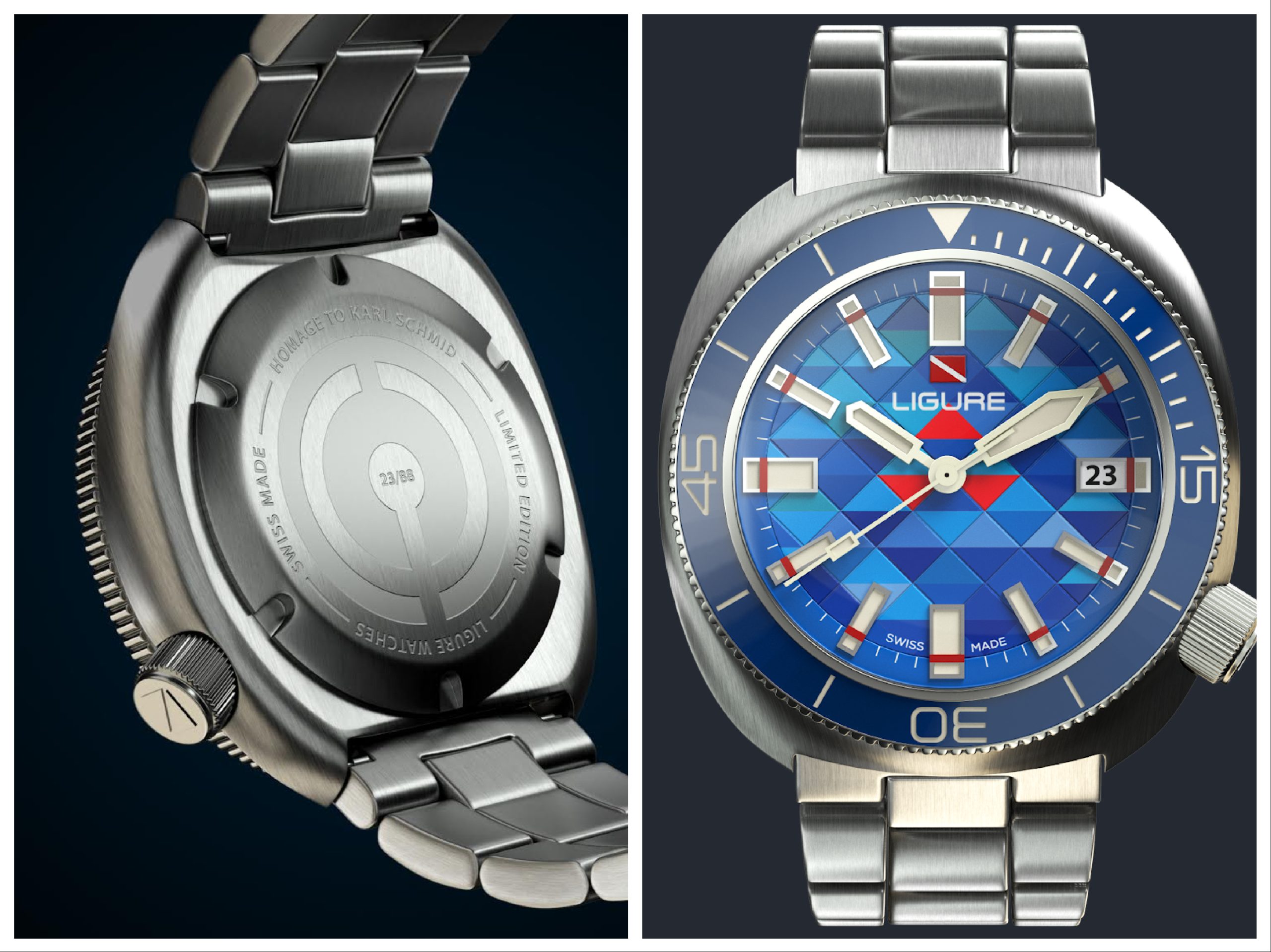 Tornando all’attualità e a questo bagnato mese di Marzo, ci occupiamo della collezione in tiratura limitata e numerata (88 esemplari) dell’orologio Ligure, omaggio a Karl Schmid e alle idee che hanno unito estetica e tecnica in un segnatempo dall’iconica cassa “Tartaruga”. L’attenzione a questo punto si focalizza sul quadrante Homage, ispirato alle opere artistiche degli anni ’80, il disegno ad acquerello su una superficie variegata mostra indici applicati spazzolati e lancette appositamente disegnate, mantenendo così all’orologio uno stile personale ed elegante. Jannieke van Geet, designer degli orologi Ligure, ha dichiarato di essere profondamente onorata per aver lavorato all’artistico progetto, omaggio all’eredità lasciata da Karl Schmid.