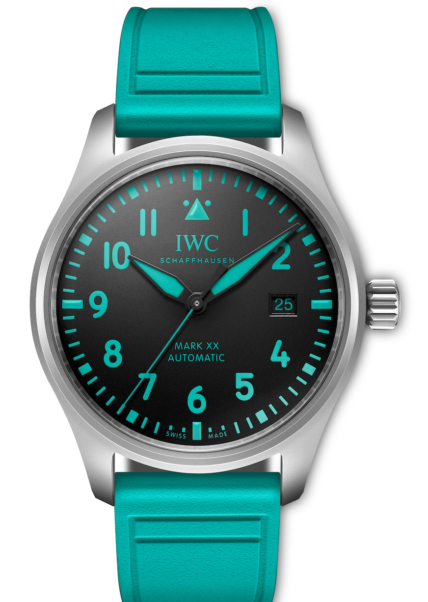 Il Pilot Watch Mark XX sarà indossato a bordo pista dai membri del team, compresi meccanici, tecnici e responsabili della strategia di gara. Il nuovo automatico ha la cassa ø 40 mm w.r. a 10 bar realizzata in titanio grado 5 color grigio opaco; sul quadrante nero dettagli nel tradizionale colore verde del Team (lancette a foglia, indici, minuteria) e, in coordinato, il cinturino in gomma dotato di sistema easy-change. Il movimento è il calibro di Manifattura IWC 3211, automatico, 28.000 A/h, 28 rubini, carica di 120 ore. Il fondello chiuso è inciso con piccoli esagoni e mostra la scritta Mercedes-AMG PETRONAS F1. Team”.