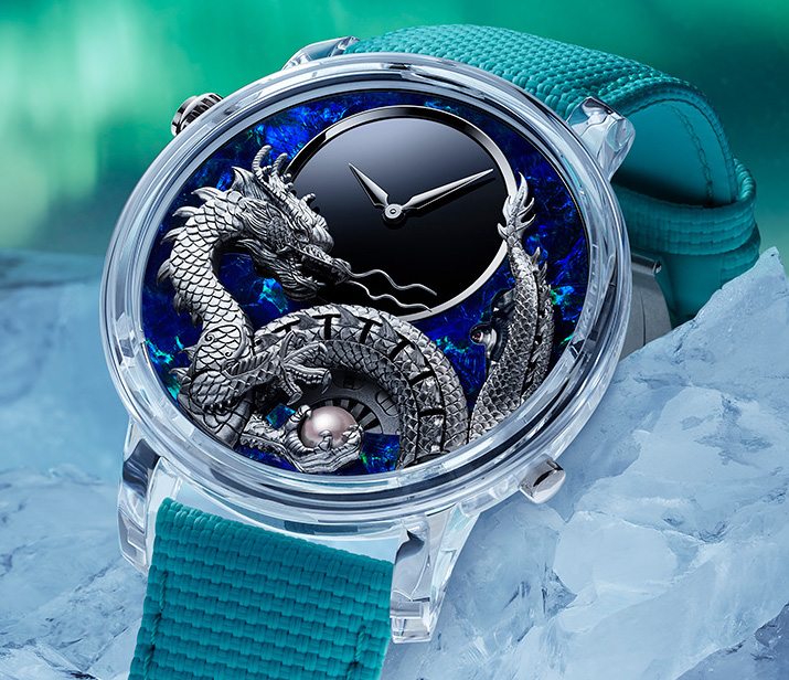 Di seguito quanto letto nel comunicato ufficiale: la schiena del drago ondeggia (e in un video che abbiamo avutola fortuna di vedere per pochi istanti, la porzione della “gobba” è abbastanza estesa però non tanto da farci arrivare ai 16…), l’occhio e la mascella si aprono e si chiudono, la lingua si muove, la cresta si solleva e ricade, le zampe afferrano una perla che gira su se stessa (non si tratta di una perla qualsiasi ma di una Akoya, coltivata esclusivamente in Giappone secondo tecniche tradizionali che le conferiscono una brillantezza diversa da qualsiasi altra perla ed è la prima volta che Jaquet Droz inserisce nei suoi orologi una perla Akoya). Chi conosce però la tradizione cinese sa che la perla fra gli artigli del dragone è una perla fatata che, una volta afferrata, fa crescere il potere del dragone.