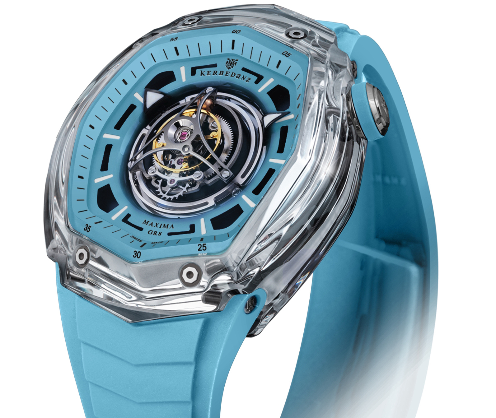 Kerbedanz Maxima GR8 Baby Blue, RG8-1 registered in GPHG 2025, limited and certificated edition (50 watches) has the largest Tourbillon Volant cage in the world; crystal sapphire case and authomatic movement.