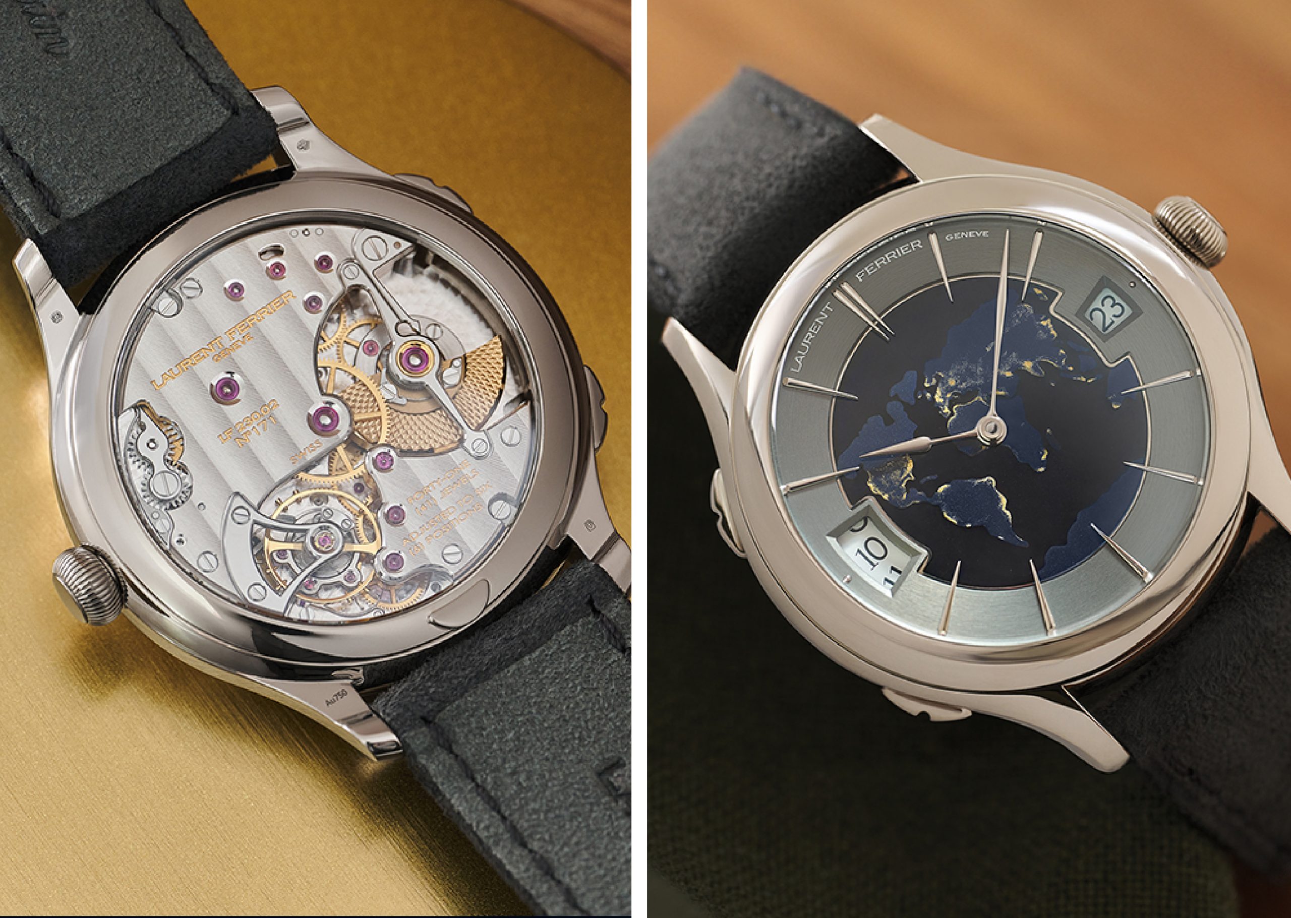 La versione attuale infatti ha il quadrante realizzato con smalti micropittura che testimonia il “savoir faire” di Laurent Ferrrier anche in questa difficile specializzazione artistica. Al centro del quadrante bombato per riprodurre la forma del globo terrestre, i cinque continenti in oro bianco, dipinti con smalto champlevée blu, sono circondati dal blu profondo degli Oceani. Sulla Terra ci sono le città e le loro luci, viste dallo spazio, sono state interpretate con minuscoli tocchi di smalto d’oro; a tutto ciò si aggiunge la difficoltà di impiegare l’alta temperatura del forno ad ognuno dei cinque stesure di colore.