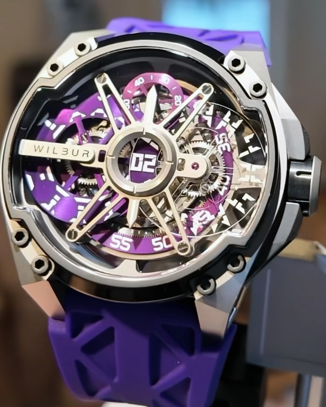 Nella gamma dei Supermachine Leo della Wilbur Watch (nati dall’idea di “Dreams of Machines”)è arrivato il Leo JW1.6 con la nuova colorazione viola brillante, definita Superviolet, impiegata sia sul quadrante sia per il cinturino in silicone. Lo studio e i test che hanno portato a questa produzione, sono durati sei anni; la cassa in titanio con fondo a vista, ha un diametro di 46 mm, è w.r. a 3 ATM ed è realizzata in titanio grezzo o trattato DLC; il movimento automatico con ore saltanti è stato disegnato in house da Jason Wilbur; realizzato in Svizzera ha 27 rubini e 28.800 A/h. Nel quadrante scheletrato i dischi sovrapposti indicano in alto i secondi, i minuti in basso e le ore al centro. Nel suo complesso il Leo JW1,6 si ispira ai misteri dell’incidente di Roswell (l’UFO avvistato nel 1947 e caduto nel New Mexico) rappresentati con simboli criptici e sequenze numeriche parziali impiegando un linguaggio ultraterreno che, indirizzato agli appassionati di questo comparto, intende mostrare il futuro del design orologiero.