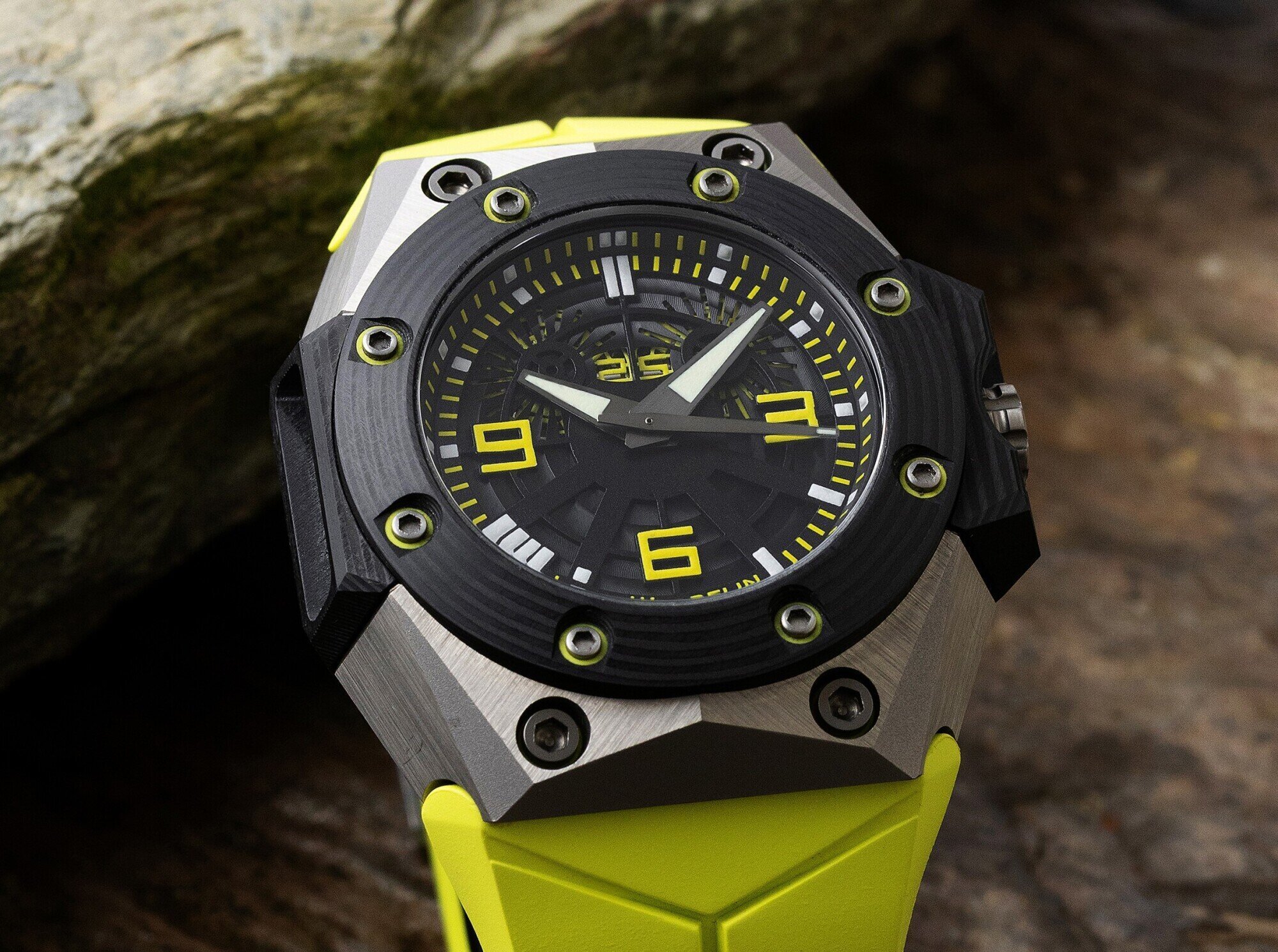 Queste le principali caratteristiche di questo pezzo unico. La cassa, mm 44×46, w.r. a m.300, è una combinazione di carbonio 3DTP e titanio 2 con finitura satinata, la corona è a vite. Il fondo in titanio reca l’incisione del polipo; la lunetta in Carbonio 3DTP è in titanio. Il movimento automatico è il Dubois Dépraz calibro 14580 (A/h 28.800, rubini 23, riserva, carica 44 h) modificato per Linde Werdelin con la complicazione della doppia data. Il quadrante strutturato come il simbolico polipo è nero con dettagli gialli. Quando l’Oktopus II fu lanciato nel 2012, tutti gli 88 pezzi furono esauriti in un batter d’occhio; quello che l’azienda propone oggi è quindi una occasione unica per gli amanti di questo interessante subacqueo. Maggiori informazioni scrivendo a: info@lindewerdelin.com.
