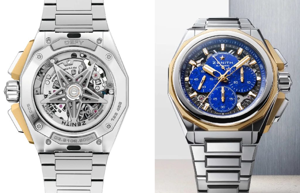 Il Defy Extreme Lapislazzuli del 160° anniversario con cassa, 45 mm w.r. a 20 atmosfere, in oro microsabbiato e acciaio lucido è stato realizzato in una tiratura limitata di 50 esemplari, il quadrante è scheletrato per far vedere il movimento automatico calibro El Primero 9004 che può misurare 1/100 di secondo grazie a due scappamenti indipendenti: uno che oscilla alla frequenza di 5 Hz (36.000 A/ora) per il cronometraggio dell’orologio, l’altro alla frequenza di 50 Hz (360.000 A/ora) rilevata dalla lancetta centrale che effettua una rotazione del quadrante ogni secondo, per il cronografo. Il contatore dei secondi cronografici è a ore 6, i minuti cronografici sono indicati a ore 3, l’indicatore della riserva di carica è a ore 12 e i piccoli secondi si vedono a ore 9. il cristallo di zaffiro anche sul retro protegge la massa oscillante a forma di stella con finitura satinata. Sul quadrante sono luminescenti le lancette e gli indici applicati, entrambi placcati oro. Bracciale integrato in acciaio inossidabile, 2 i cinturini aggiuntivi inclusi: 1 in caucciù nero con fibbia déployante e 1 in Velcro nero.