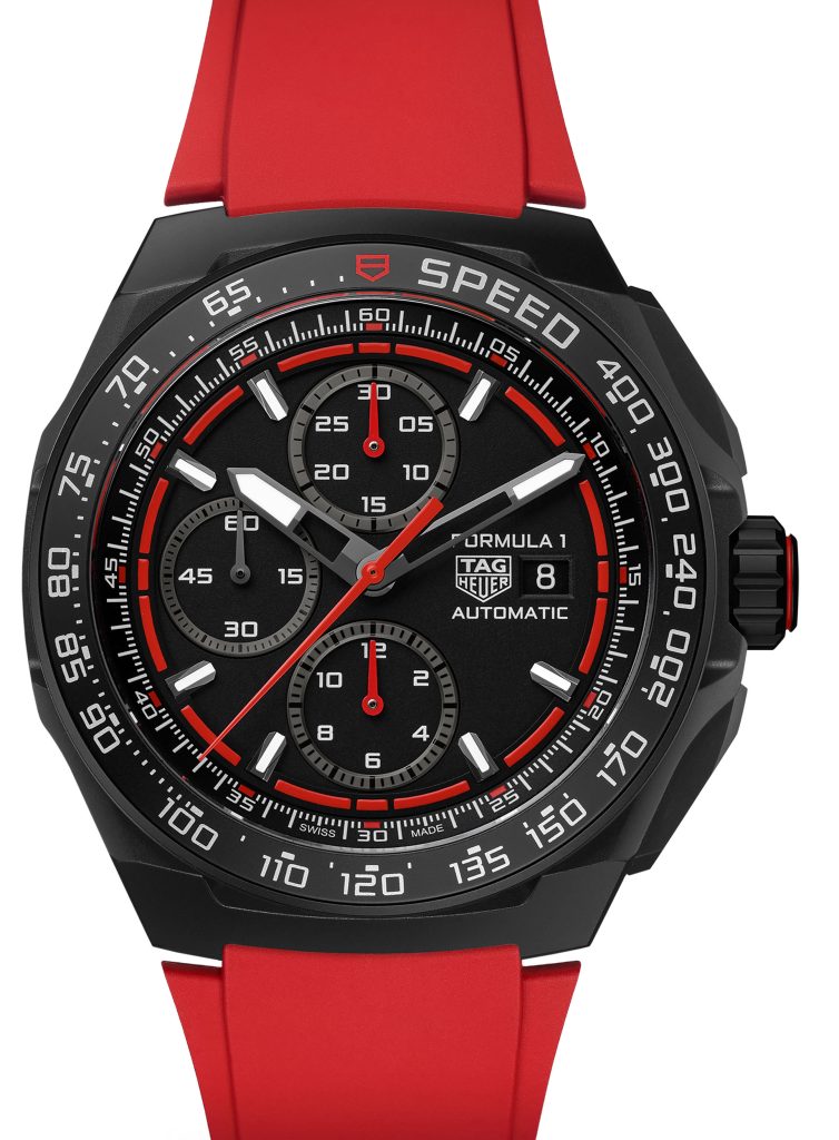Torna, dopo quella lanciata nel 1986 con movimento al quarzo, una collezione di TAG Heuer dedicata alla Formula 1 con movimento automatico; ne fanno parte un cronografo in quattro varianti e il Formula 1 Chronograph x Oracle Red Bull Racing. La cassa del nuovo F1, ø 44 mm w.r.a m.200 è in titanio sabbiato grado 2; la corona a vite è in titanio DLC nero come i pulsanti e la lunetta, su questa, in bianco, risalta la scala della velocità; il quadrante opalino nero ha la minuteria laccata rossa, indici e lancette luminescenti Superluminova; a ore 3 si vede la data, alle 12 i 30 minuti, alle 6 le 12 ore e alle 9 l’indicazione cronografica del quarto di secondo. Il movimento a carica automatica è il nuovo Calibro 16 (A/h 28.800, cronografia a 1/4 di secondo, riserva di carica 42 h). Infine il cinturino in caucciù rosso accentua l’immagine di un cronografo che fa della velocità il suo scopo; se lo si acquista sul sito ufficiale viene data in omaggio anche una confezione esclusiva e una pratica custodia.