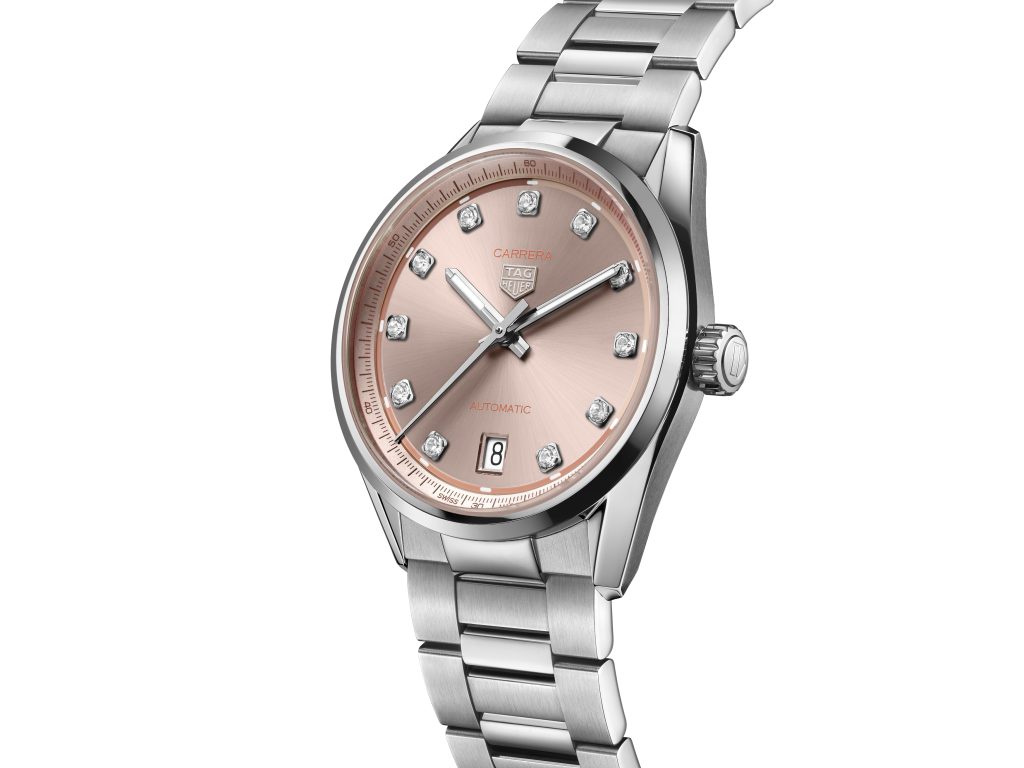 Ancora un TAG Heuer Carrera adatto all’imminente primavera con il Carrera Date quadrante rosa cipria lavorato effetto soleil o lilla con lavorazione verticale; su entrambi 11 indici in diamanti. La cassa in acciaio ø 36 mm w.r. a m.100 (completata dal bracciale integrato a tre maglie a forma di H lucide e satinate) accoglie il nuovo movimento svizzero automatico Calibro 7 con riserva di carica di 56 h.