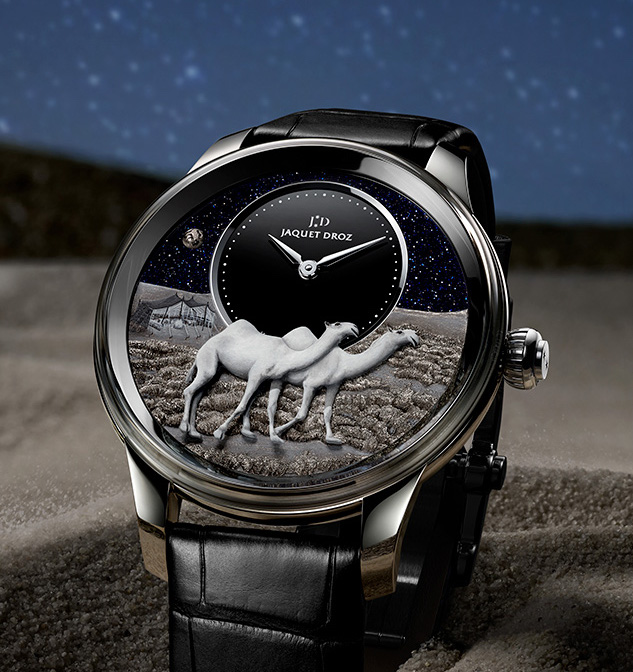 Il titolo del progetto è “Camels Magìe d’Orient”, ma dobbiamo tirare le orecchie a chi lo ha scelto, perché la scena riprodotta sul quadrante d’oro con micropittura, mostra due dromedari, animali che a differenza dei cammelli hanno una gobba sola e non due. Detto ciò passiamo ad altri dettagli. Nella cassa in platino è inserito un movimento a carica automatica che sulla massa oscillante reca inciso il muso del dromedario, scelto tra i numerosi disegni realizzati dall’abile mano dell’artista che lavora da Jaquet Droz; sul cielo ricavato dall’avventurina è stato posizionato alle 12 il sottoquadrante (circondato da un filo in oro bianco) delle ore e dei minuti con sottili lancette in oro bianco, la luna d’oro in alto sulla sinistra è cesellata a mano. L’ampia porzione del deserto sul quale si muovono i dromedari è realizzata a micropittura nel caldo colore della sabbia che fa risaltare piccole dune sulla base in oro, in lontananza si scorgono una tenda e un fuoco acceso