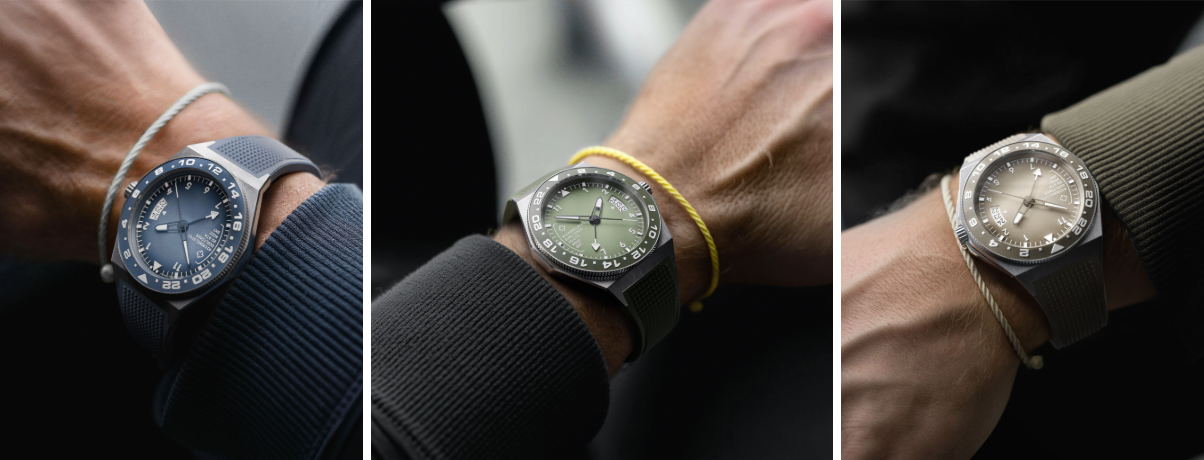 A di là dei colori, nelle casse in acciaio inossidabile ø 42 mm (w.r.a 20 ATM) con fondo a vista (e sul quale si può far incidere una frase) è inserito il movimento automatico Sellita SW330-2 che mostra l’ora del secondo fuso orario sulla lunetta. Sul quadrante le lancette sono trattate Super-LumiNova X1 in tonalità blu per la lancetta del GMT e verde per quella di ore e minuti, anche gli indici sono luminescenti. Ogni versione offre la scelta del bracciale in acciaio oppure del cinturino in pelle o in caucciù (tutti con sistema per una rapida sostituzione e per adattarsi ad ogni polso).