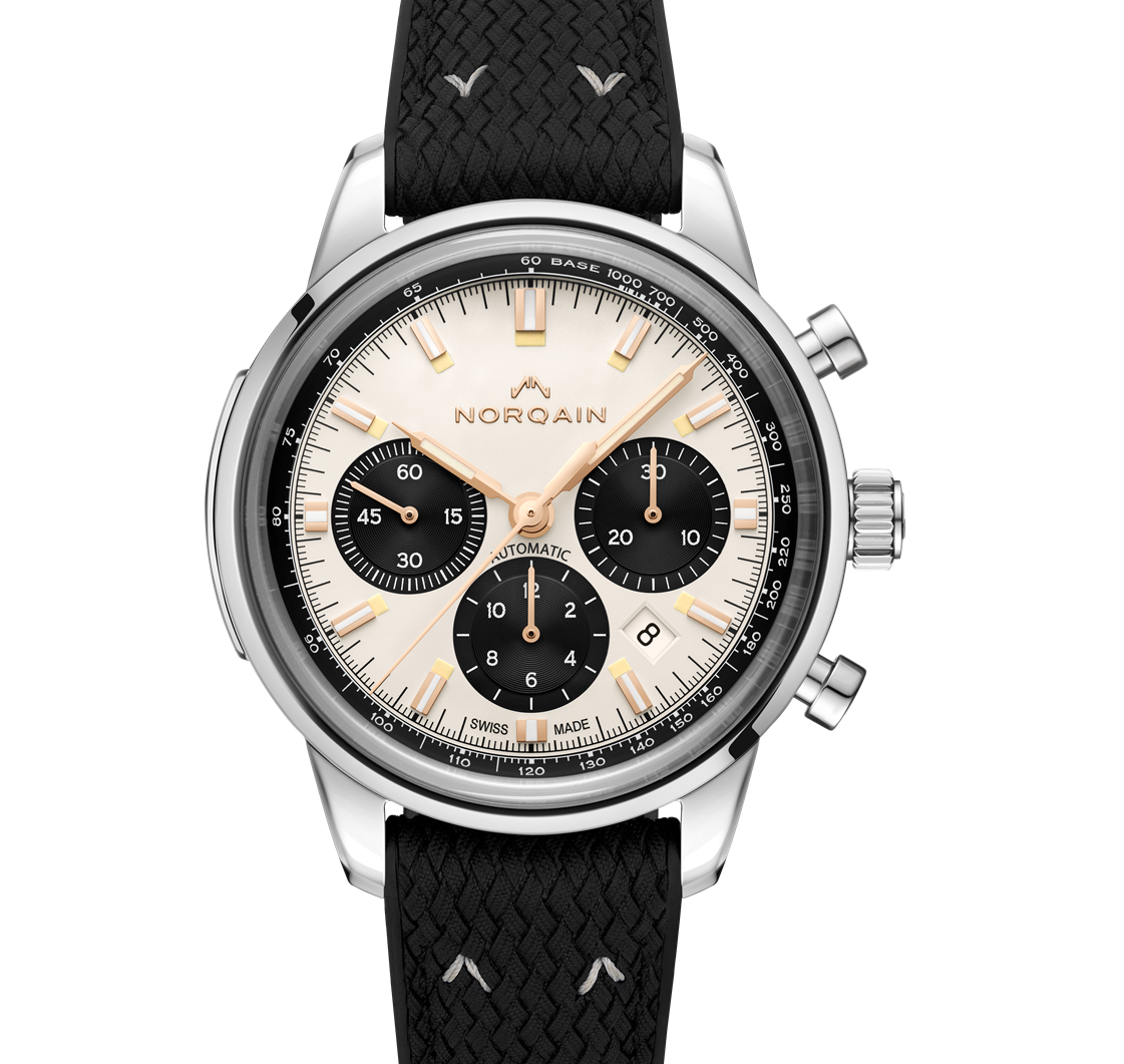 Il Freedom 60 Chrono Off White, realizzato in edizione limitata a 300 esemplari è un cronografo automatico con 62 ore di riserva di carica; dal fondo a vista si ammira il movimento, Calibro Norqain N19 su base SW 510a (A/h 28.800, rubini 27, massa oscillante personalizzata Norqain, riserva di carica 62 ore). Il quadrante bombato color avorio con la bianca scala tachimetrica su un anello nero, si riallaccia al gusto degli eleganti orologi vintage, le lancette di ore e minuti placcate in oro rosso sono sfaccettate e diamantate, placcati rosso anche gli indici piatti bianchi taglio diamante, trattati Super-LumiNova® X1 al radio. I tre contatori neri dei minuti, delle ore e dei piccoli secondi risaltano sul fondo avorio con lancette placcate oro rosso. Il quadrante è protetto da cristallo di zaffiro bombato, quello piatto sul fondo lascia leggere “LIMITED EDITION ONE of 300”. La cassa in acciaio inossidabile 316 L w.r. a m.100 misura 43 mm e ha uno spessore di mm 15; sulla corona a vite il logo Norqain e sul lato sinistro della cassa la placchetta in acciaio inossidabile 316L ha inciso il logo. Questi i cinturini disponibili: in Alcantara o in Perlon nero, ma è anche disponibile il bracciale in acciaio.