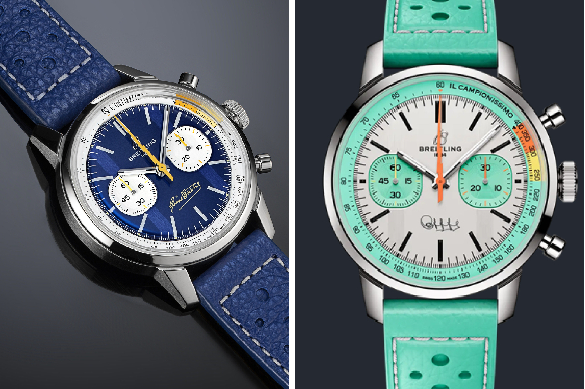 Entrambe le novità, cassa in acciaio inossidabile ø 41 mm w.r. a m.100 completata da cinturino in pelle, sono equipaggiate con il movimento automatico di Manifattura Breitling 01; questo visibile dal fondello in vetro zaffiro, è certificato COSC e ha una carica di 70 ore, 47 rubini e 28.800 A/h; l’anello esterno reca le incisioni «Gino Bartali Tribute» e «One of 750». Sul quadrante blu la firma e dettagli gialli che richiamano la maglia del campione toscano, sulla scala tachimetrica una parola sola, ma sufficiente: l’Intramontabile. Identiche caratteristiche tecniche per il cronografo dedicato a Fausto Coppi, per lui la parola che si legge sulla lunetta è “il Campionissimo” e dal vetro zaffiro sul fondello le incisioni “Fausto Coppi Tribute” e “One of 750”.