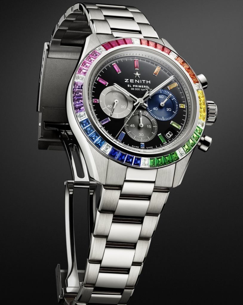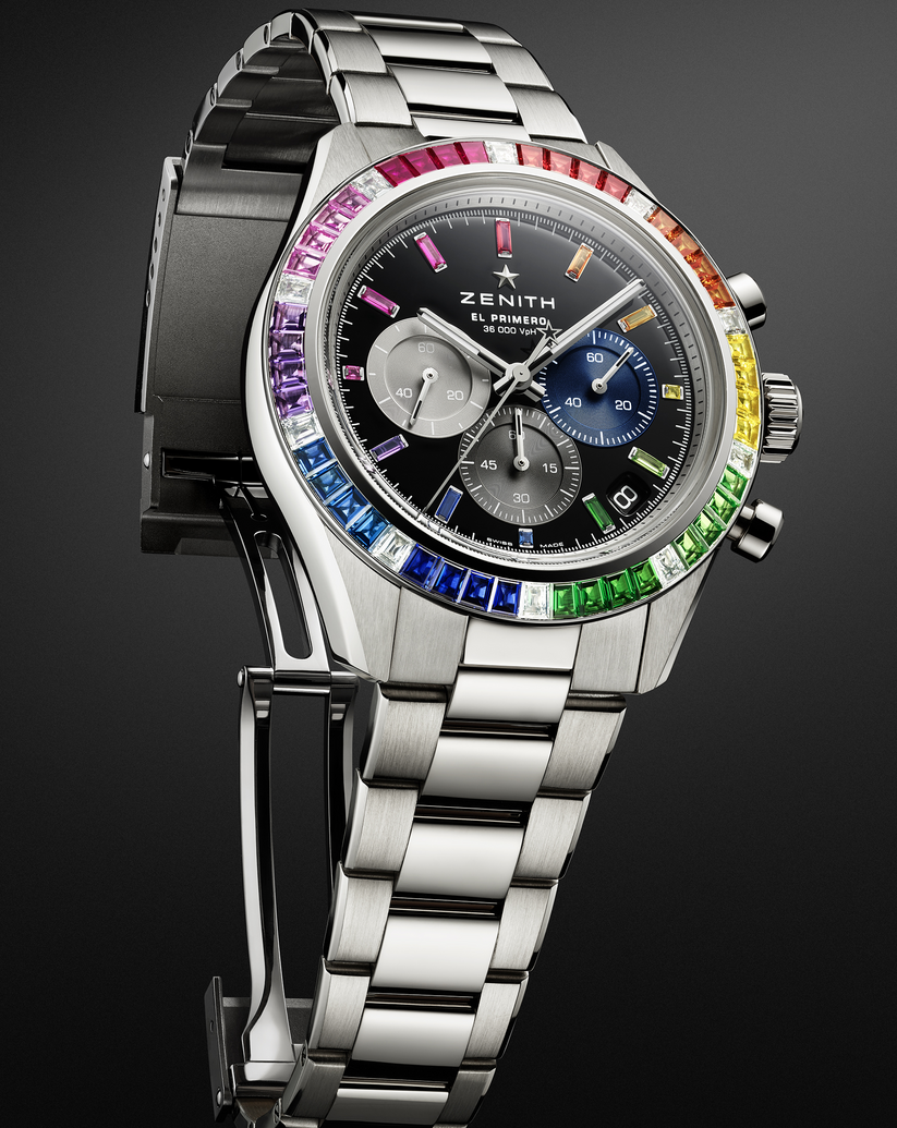 Questo Chronomaster Sport ha la cassa in oro bianco diametro 41 mm con analogo bracciale Sulla lunetta sono incastonate cinquanta pietre preziose: diamanti bianchi taglio baguette e zaffiri nelle tinte dell’arcobaleno. Prezioso anche il quadrante laccato nero con contatori tricolore applicati e indici in zaffiri arcobaleno. Il movimento cronografico automatico ad alta frequenza è il Calibro El Primero 3600 che consente la lettura del decimo di secondo e ha una riserva di carica di 60 ore.