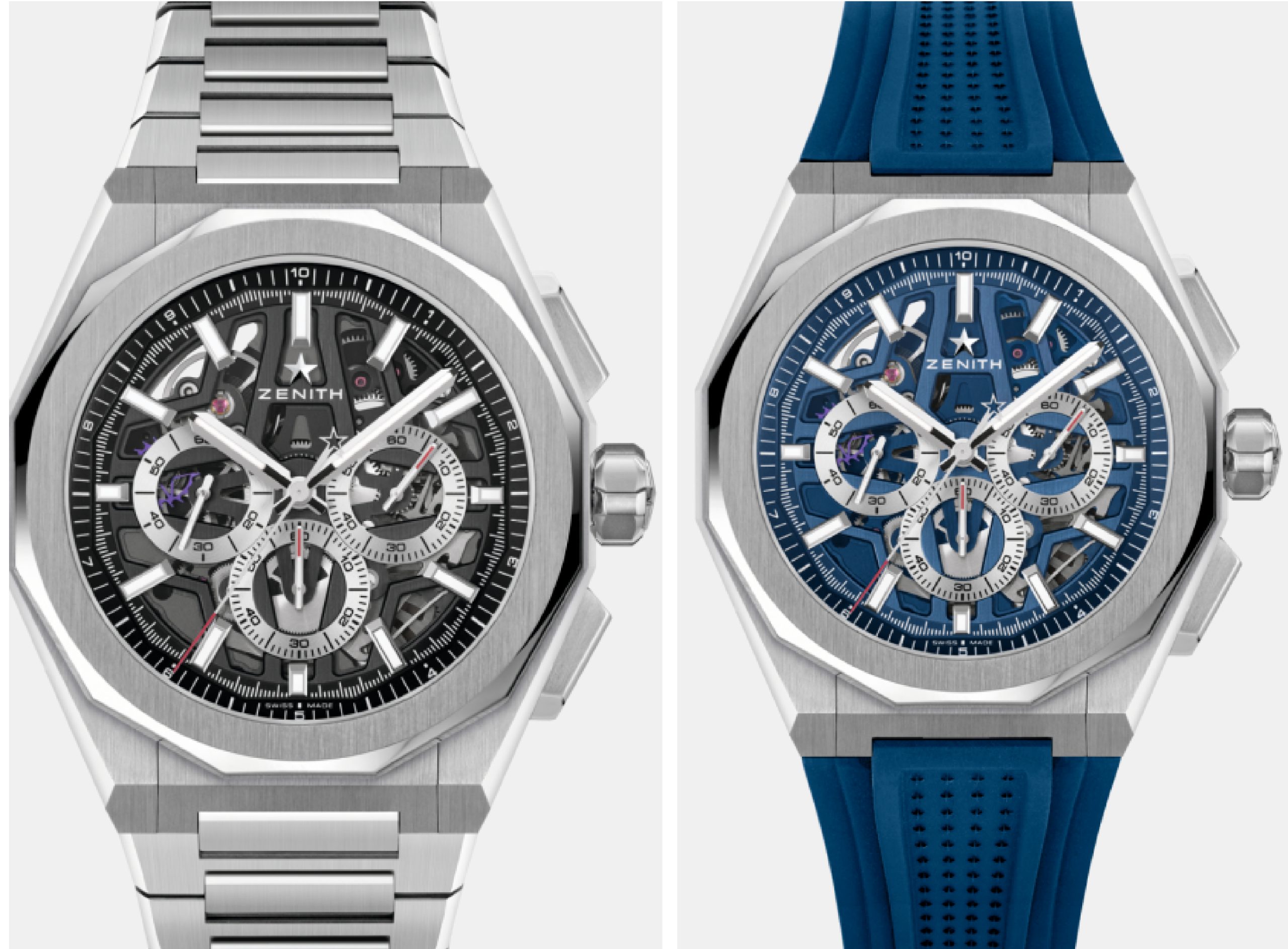 Il DEFY Skyline Chronograph Skeleton con cassa ottagonale in acciaio da 42 mm e lunetta sfaccettata, caratterizzato da un quadrante aperto blu con contatori argentati a contrasto. Animato dal movimento cronografo automatico di manifattura ad alta frequenza El Primero 3600SK scheletrato, dotato del primissimo indicatore con precisione al 1/10 di secondo. Si può sceglierlo con il bracciale in acciaio o con il cinturino in caucciù blu con motivo impresso, entrambi facilmente intercambiabili grazie all’ingegnoso sistema di sostituzione.