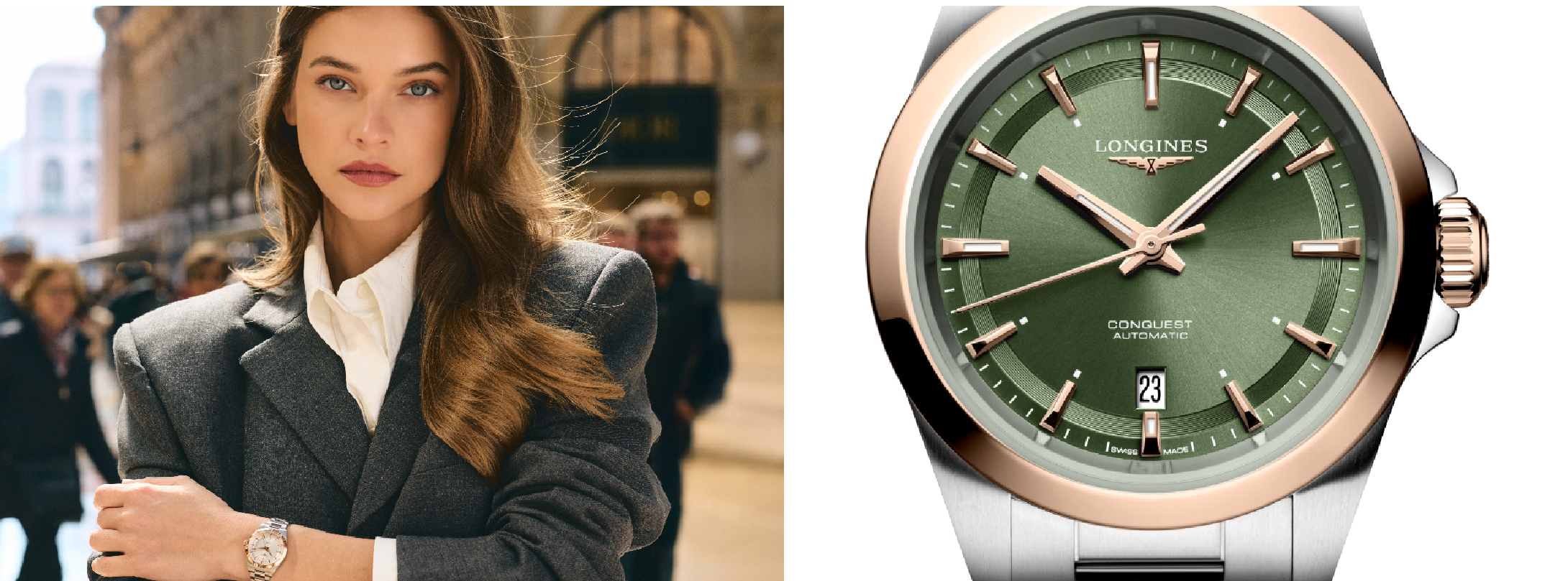 Nel 2025 i Conquest di Longines si presentano con nuove misure e nuove colorazioni; sono orologi eleganti, ma anche da indossare quotidianamente, come dimostrato nella foto scelta, scattata nel “salotto di Milano” la Galleria Vittorio Emanuele.