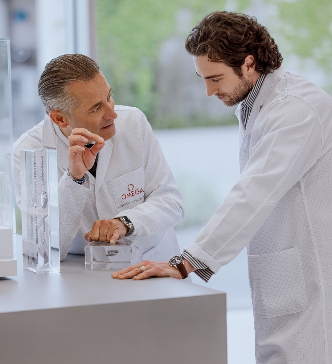 L’attore britannico Aaron Taylor-Johnson, che è diventato global Ambassador del Marchio elvetico, è ritratto, in maggio, insieme a Raynald Aeschlimann, Presidente e CEO di OMEGA, durante la visita agli stabilimenti di Bienne; al polso l’attore e il presidente-Ceo indossano uno Speedmaster First OMEGA in Space.