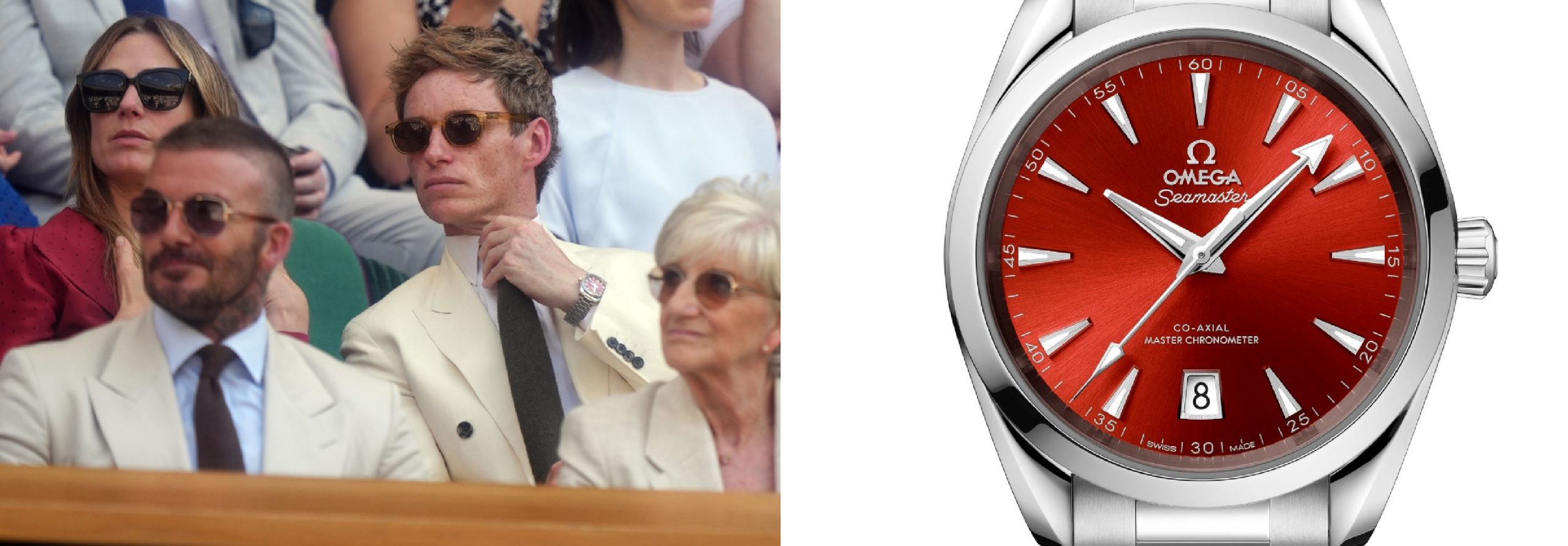 L’attore ha abbinato al suo abito bianco, in omaggio alla tradizione, un Omega (ref.220.10.38.20.13.003) in acciaio inossidabile. L’orologio diametro 38 mm, si distingue per il quadrante terracotta, laccato e spazzolato. Peccato però che l’Omega con quadrante terracotta, che ricorda la superficie dei campi da tennis, sia più adatto al Roland Garros che a Wimbledon. Tutti sanno che in Inghilterra il campo di gioco a è l’erba verde, opportunamente bagnata per non diventare gialla e secca con il caldo di queste giornate.