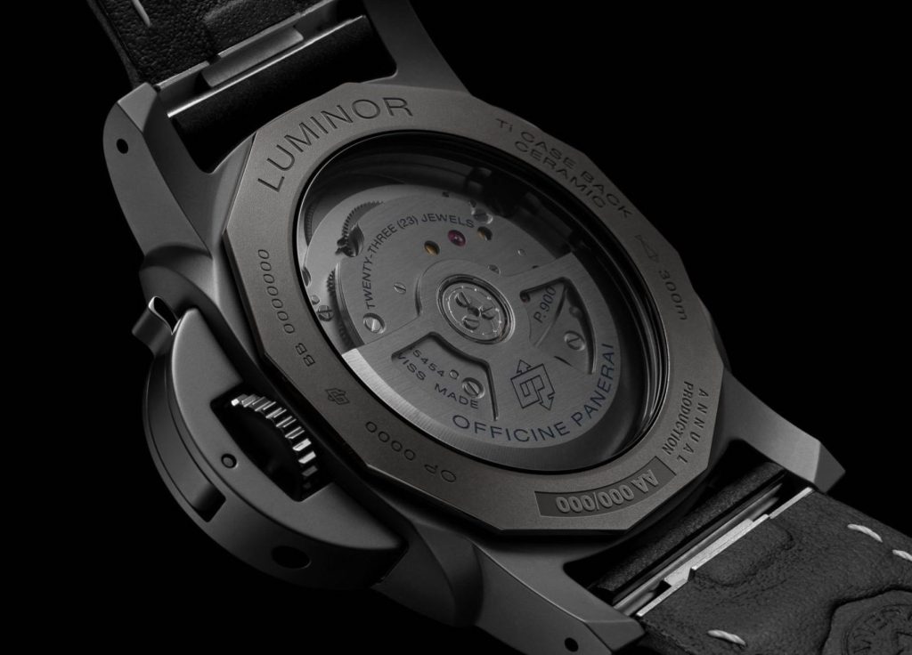 Queste le altre caratteristiche orologiere. Il movimento è il calibro automatico P.900/GMT (12H), prodotto presso ValFleurier, che era stato già adottato nei Luminor Quaranta BiTempo e nei Submersible GMT Navy SEAL ø 44 mm. Il fondello a vite in titanio grado 5 con oblò in vetro zaffiro fumé consente di ammirare questo automatico le cui A/h sono 28.800, la riserva di carica arriva a tre giorni con un solo bariletto; grazie allo stop-secondi la regolazione è estremamente precisa; le anse sono rinforzate e la corona è protetta; ogni orologio è testato a una pressione superiore del 25% rispetto alla profondità indicata, a ulteriore conferma della sua affidabilità in immersione.