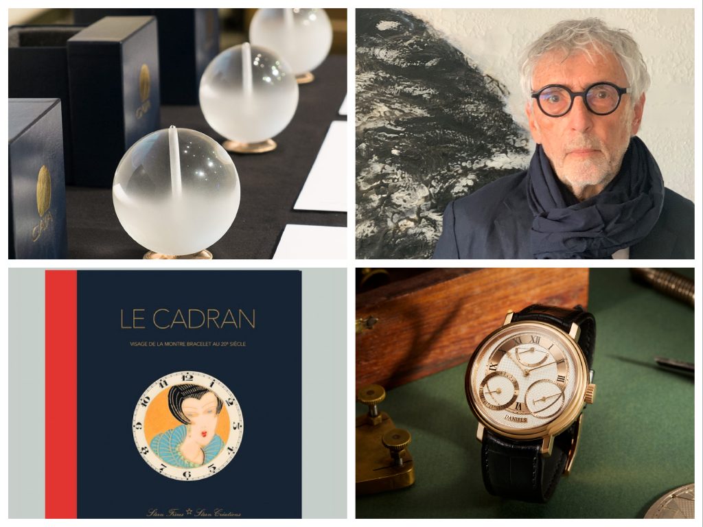 Nella foto in senso orario, il globo di Gaïa, la Madre Terra, che dal secolo scorso è il simbolo del Premio; Jean-Jacques Paolini per lo spirito imprenditoriale; Roger Smith per la ricerca storica con la riedizione di un orologio da polso e il volume Le Cadran di Helmuth Crott per la creatività artigianale. Per i più giovani ricordiamo che il tedesco Helmuth Crott è stato un grande appassionato di orologi, notissimo nel XX secolo anche nel campo delle Aste, come ricercatore e scrittore; il suo libro Le Cadran (stampato per la prima volta in francese, di qui il titolo in quella lingua) è una panoramica dei quadranti dell’orologio da polso, ne presenta ben 600, diversi uno dall’altro, nelle 392 pagine.