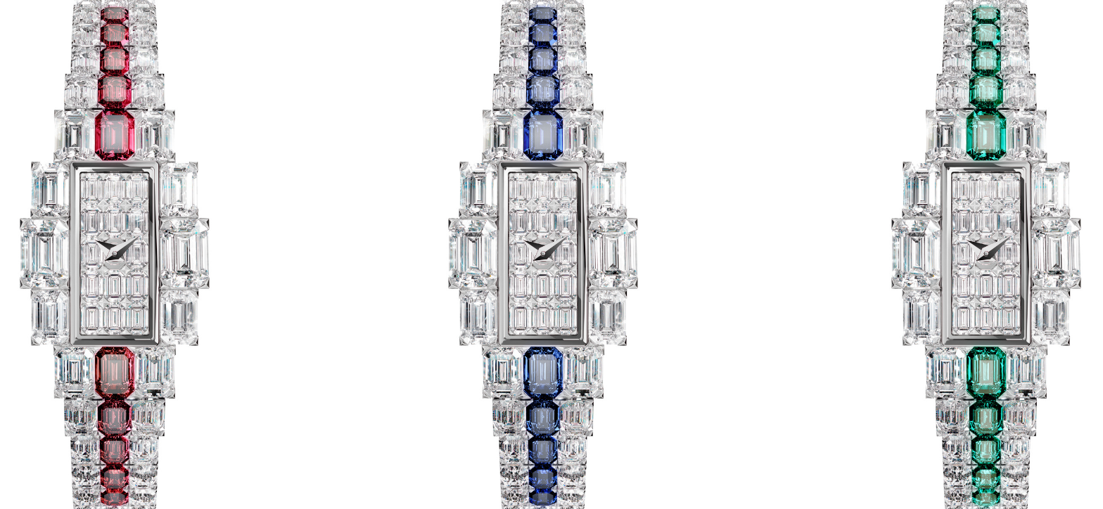 La cassa in oro bianco (o platino per quella con smeraldi) misura 19,4 mm x 30,1 mm, spessore (8,3 mm) è interamente pavé con 10 diamanti taglio smeraldo (5,84 carati circa) e 2 rubini (o zaffiri) certificati SSEF, taglio smeraldo (1,06 carati circa); anche il quadrante è interamente pavé con 14 diamanti taglio smeraldo (1,54 carati circa); le lancette delle ore e dei minuti sono in oro bianco; infine il bracciale in oro bianco tutto pavé con 103 diamanti taglio smeraldo (23,26 carati circa) ha 8 rubini taglio smeraldo (2,45 carati circa) oppure 8 zaffiri o 8 smeraldi.