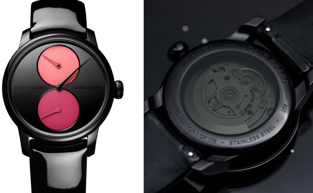 La forma della cassa, il quadrante e i colori si riallacciano alle confezioni realizzate per Sylvie Fleury e che contengono prodotti cosmetici compatti per un perfetto maquillage. Sul quadrante lucido laccato nero con dettagli analoghi il contatore delle ore è rosso corallo, quello bombato dei secondi è rosso magenta opaco, in colori analoghi le loro lancette; alle 3 il logo Louis Erard e alle 9 quello di Sylvie Fleury.